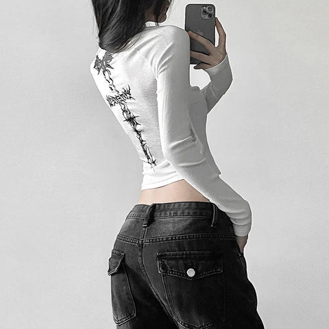 Contiguous white long-sleeve shirt with black gothic dragon print.