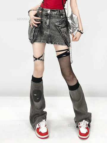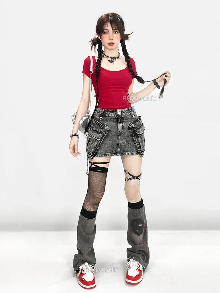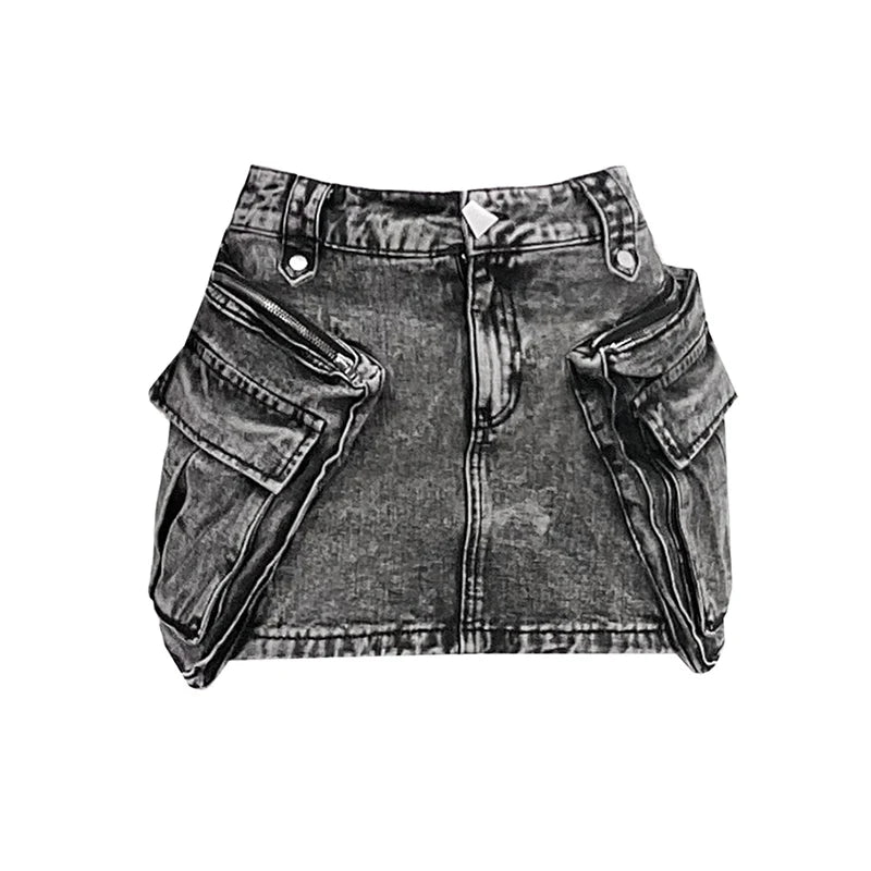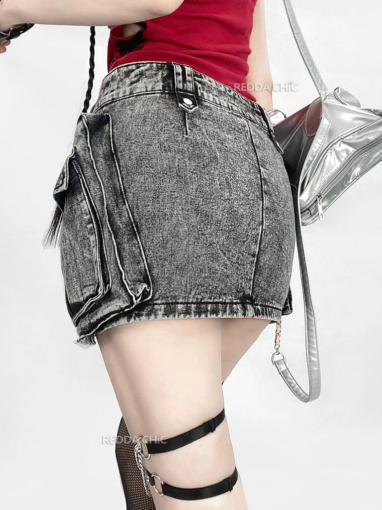 Dive into the heart of originality with our Cargo Skirt in gray retro denim. This piece is a tribute to individuality and alternative style, made for bold individuals seeking the extraordinary. With its cheeky low waist, it features a modern fit, while the large, functional pockets provide both style and practicality. The skirt becomes even more appealing with its raw edges, giving the whole look a wonderfully unstructured touch. The matching leggings, ending in a frayed hem, emphasize the subversive aesthetic of this garment and promise a completely atypical silhouette. Deliberately imperfect craftsmanship, processed gray tones for a vintage effect: each detail tells a story of rebellion against the monotony of conventional fashion.