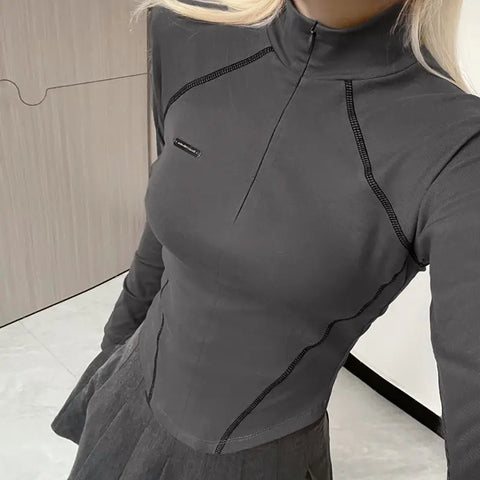 Discover the essence of urban elegance with our long-sleeve top, perfect for anyone looking to add a touch of mystery to their wardrobe. Inspired by the Acubi style, this top is a must-have for anyone wanting to express their individuality in a refined way. Crafted from a black fabric with impeccable comfort, the top features an elegant stand collar, a subtle zipper, and contrasting seam details that subtly highlight the lines of your silhouette. A small metal label adds a touch of sophistication without being intrusive. Whether you pair it with slim-fit trousers or a flared skirt, this top is a versatile piece that suits any occasion - from the bustling energy of a hectic city day to the intimate ambiance of an evening with friends. Dare to express your uniqueness without sacrificing comfort and elegance. Our long-sleeve top is designed to turn heads while you stay true to your alternative and avant-garde style.