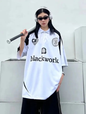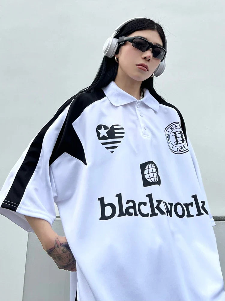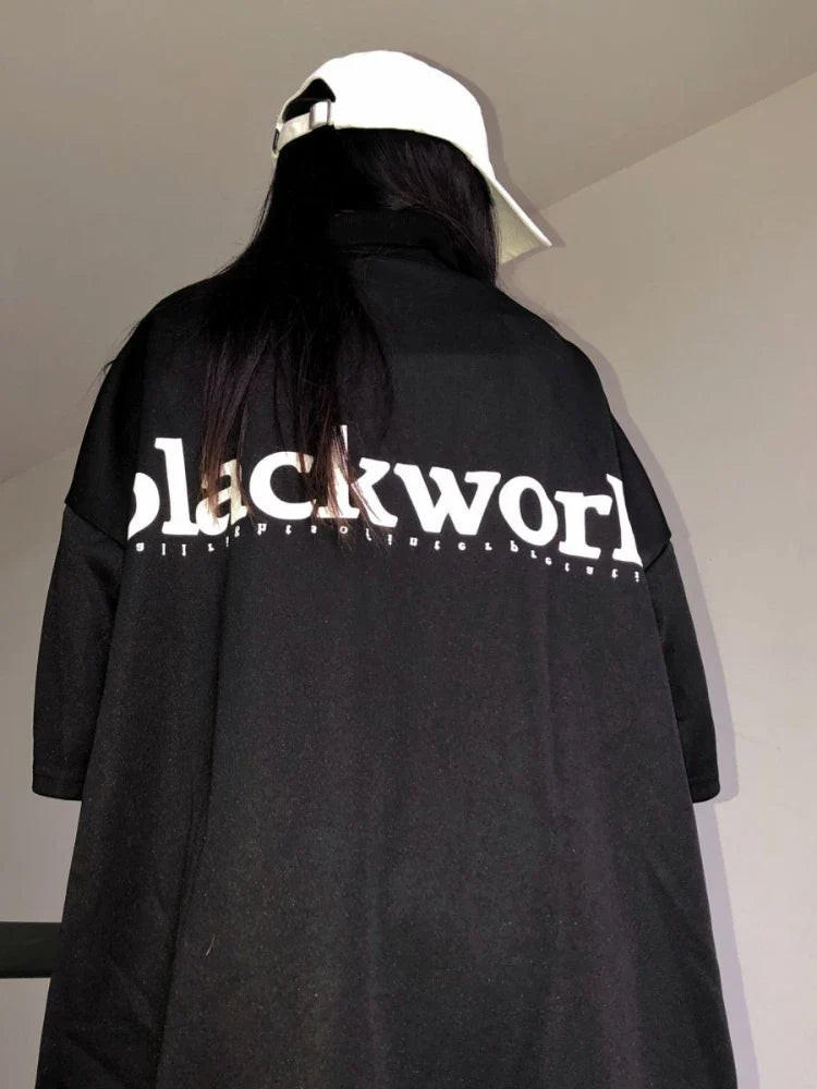 Immerse yourself in the world of vintage streetwear with our Acubi Short Sleeve Shirt. Designed for those who dare to stand out from the crowd, it is the ultimate expression of alternative style paired with casual comfort. The bold two-tone design in black and white features striking graphic motifs: a heart that transforms into a star, and vintage emblems that evoke the rebellious spirit and nostalgia of years gone by. The loose fit invites freedom of movement, while the classic collar and clean finishes add a touch of unusual sophistication. The word "blackwork" prominently displays on the front, emphasizing your unique identity and affiliation with urban counterculture. Wear it with distressed jeans for a complete street look, or break the codes by pairing it with fitted suit trousers.