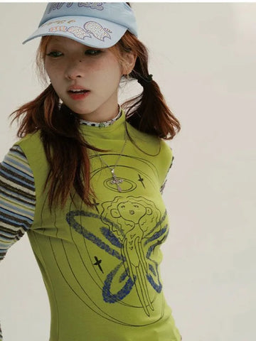 Experience the ultimate nostalgia of the 2000s with our green striped vintage T-shirt, a must-have for all Acubi fashion fans. This top is designed for women who dare to show their individuality and makes a bold and colorful fashion statement. With its vibrant stripes in lime green and blue, this long-sleeved T-shirt takes you back to the Y2K era with its unmistakable retro charm. Made from a soft, comfortable material, it promises a relaxed fit and freedom of movement all day long. The stand-up collar adds a refined and modern touch, while the central graphic depicting a stylized angel figure brings an artistic and rebellious dimension. Reinvent your wardrobe with this piece from the Acubi collection, perfect for making a statement, whether on the bustling streets of the city or at a gathering with friends. Pair it with straight-cut jeans or a black skirt to enhance the vintage effect, and add a pair of low-top sneakers to complete your look with a touch of casualness. With this T-shirt, you can capture the nostalgic spirit of Y2K while keeping up with contemporary trends.
