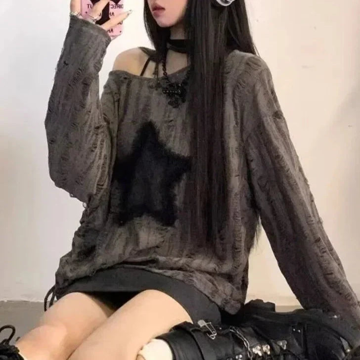 Oversized Goth Sweater with Acubi Print and Off-Shoulder Design
