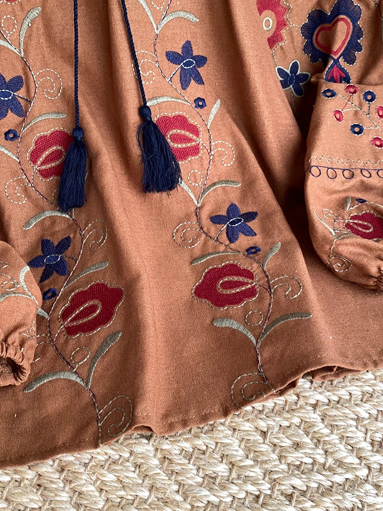 Discover a unique piece with this indie blouse in retro style that exudes originality. The natural material made from cotton and linen provides absolute comfort and breathability, ideal for sunny days or balmy summer evenings. The terracotta color is accentuated by an elaborate embroidered floral pattern that creates an artistic, rural image that draws attention. The loose, casual cut of the blouse conveys a free, bohemian lifestyle. The round neckline is decorated with delicate embroidery and is closed with a cord featuring pom-poms, giving the blouse a fashionable folk touch. The puff sleeves add elegant volume and are closed with a soft elastic band that creates a romantic effect. Whether strolling through an antique shop, on a cultural excursion, or simply to add a touch of literary elegance to everyday life, this blouse is your ally.