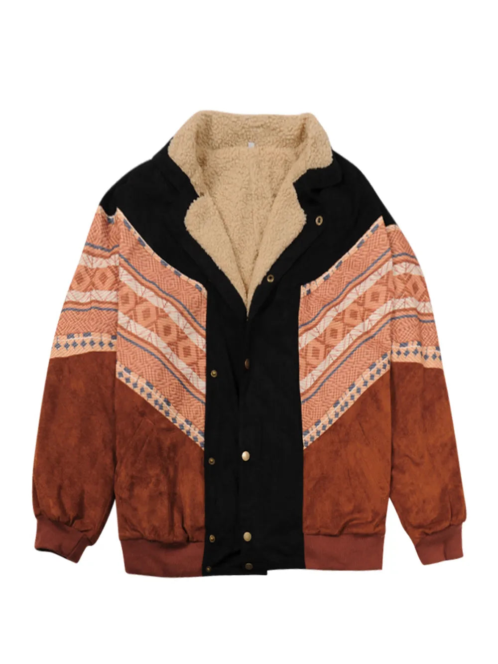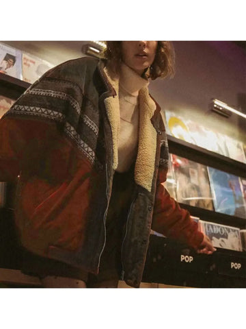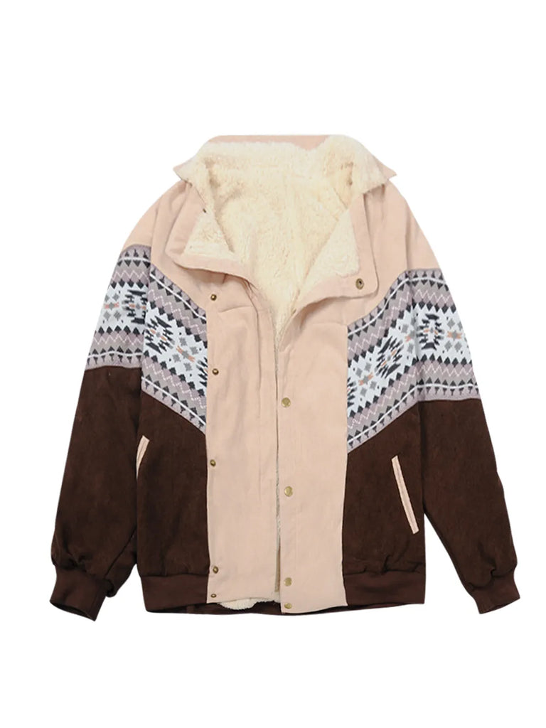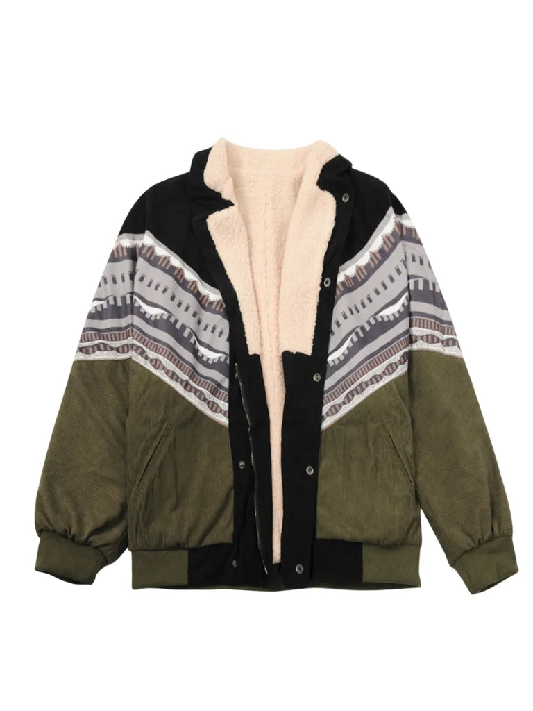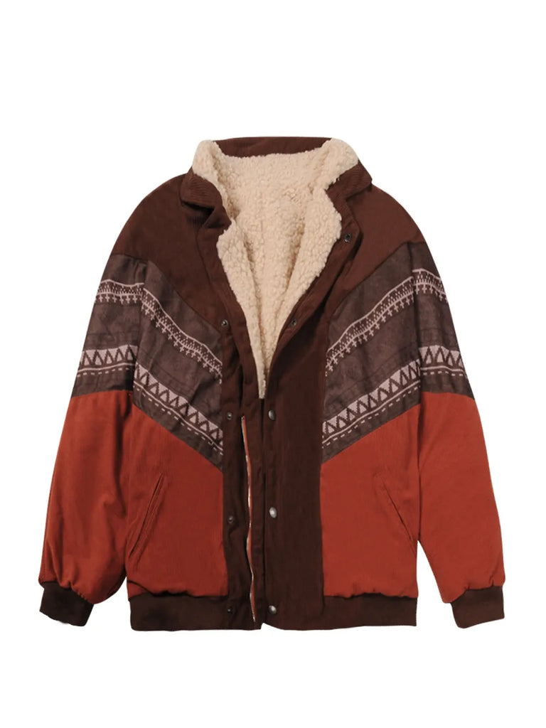 Immerse yourself in the nostalgic atmosphere of the 90s with this exquisite Fairy Grunge jacket. The jacket is made of high-quality cotton and offers unparalleled comfort. It adds an elegant boho touch to your street wardrobe. The design of this jacket catches the eye immediately: the puff sleeves made of warm brown corduroy and the inserts with geometric patterns evoke an escape into a world full of dreams and magic. The simple collar and the opening fastened with metal buttons create a strong contrast. They reflect both the boldness and the subtlety of street fashion trends. This jacket provides you with stylistic freedom and comfort that perfectly suits the cool temperatures of autumn. Whether you stroll through the cobbled streets of an old town or sip coffee in your favorite café. Pair a crop top with high-waisted jeans to keep your look casual yet elegant. This piece blends the gentle melancholy of the past with the freshness of the present, making it both retro and modern.