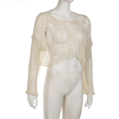 Discover the casual charm of our Bohemian Chic top, designed for women who love to stand out stylishly from the crowd. This unique top is a true work of art, combining fine crochet work with a stunning design to create a silhouette that never goes unnoticed. Made from airy crochet knit, this top offers both comfort and breathability, creating a seductive play with transparency. The neutral cream color easily pairs with your wardrobe, allowing you to recreate it again and again. The unstructured style with strategic rips and cut-outs gives this piece a rebellious and avant-garde look. Let the asymmetric cut of this top caress your curves and subtly reveal your skin. With its long, flowing sleeves, it adds a romantic touch that contrasts with the bolder details. The hanging threads add a dimension of movement and unexpectedness, as if every detail is designed to reflect your unique personality.