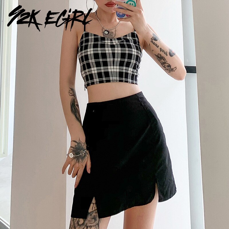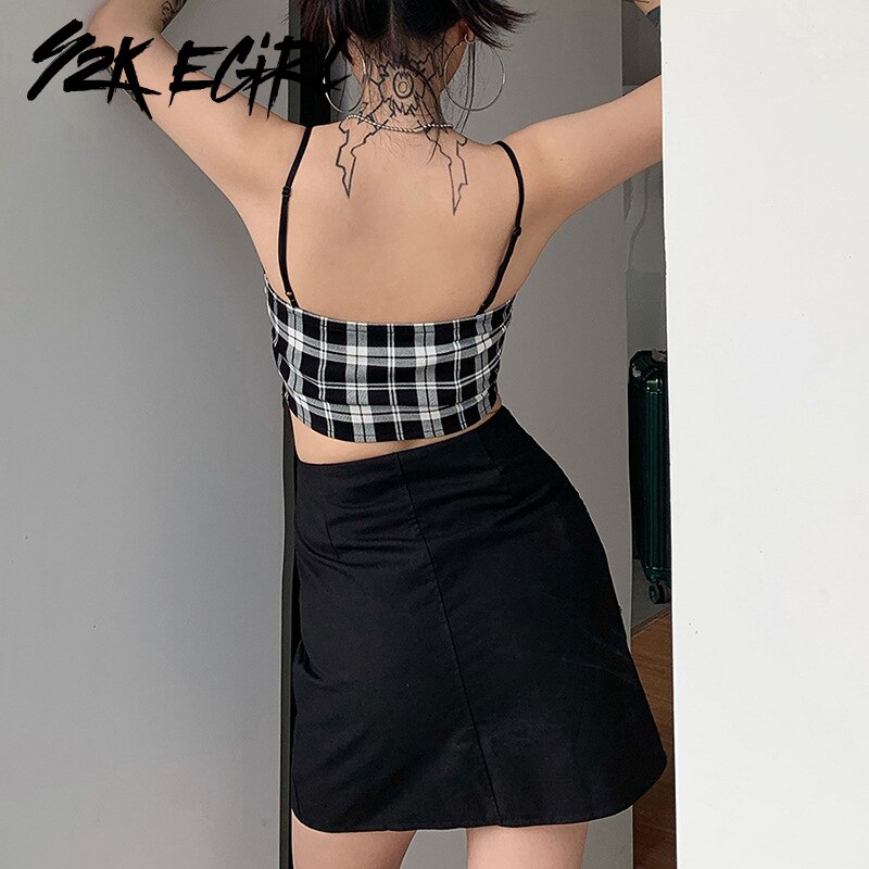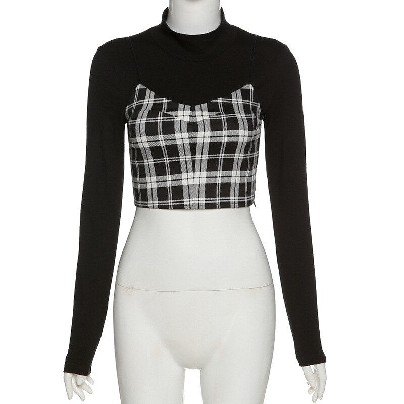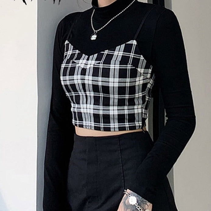 2pcs Sexy E-Girl Plaid Cami and Black Crop Top Long Sleeve