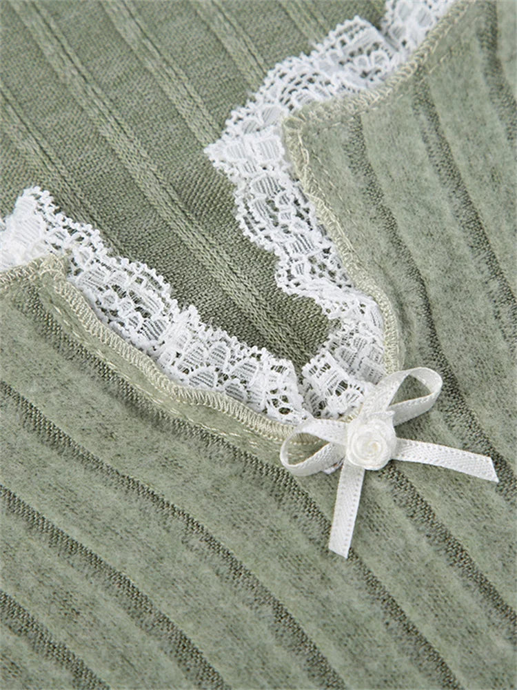 Immerse yourself in a world of comfort and style with our green crop top. It is designed to add a touch of boldness to your summer wardrobe. The meticulously crafted top features elegant long sleeves that flirt with the spring breeze. The ribbed knit hugs your curves, creating a casual yet alluring look, while the deep neckline adorned with delicate lace and a small bow adds a feminine touch. The unique design of the crop top is characterized by a pointed, asymmetrical hem that highlights your silhouette and reveals just the right amount of skin. Pair it with high-waisted jeans or a fitted skirt for a refined grunge look or opt for a softer style by wearing it with pastel-colored shorts. Whatever your plans are, this versatile top is sure to turn heads and accentuate your alternative style.