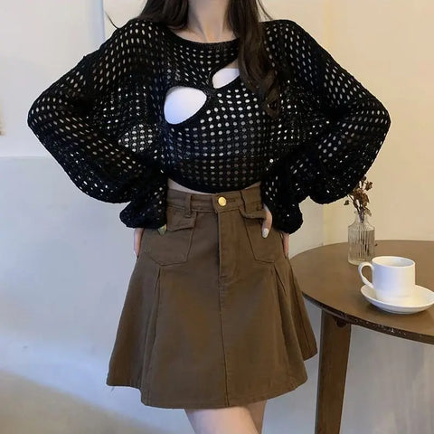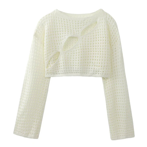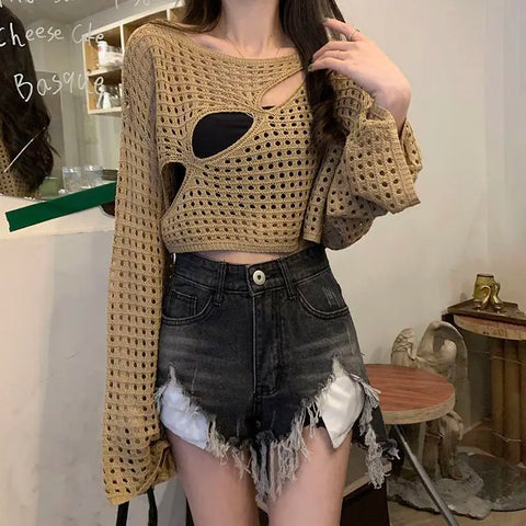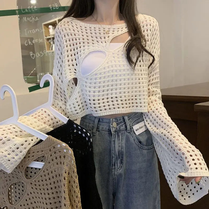 Immerse yourself in the world of alternative fashion with this crop top by Acubi, a daring yet delicately knitted piece. With its blend of contemporary Korean aesthetics and rebellious flair, this top is the perfect companion for those who dare to dance out of line. The open-knit fabric creates an exciting play with transparency, subtly revealing just as much as it suggests. The long sleeves and the O-neck collar balance the overall look, while the crop cut tastefully emphasizes the waist. Made from soft, breathable materials, this pullover ensures you feel comfortable all day long. Whether you wear it for a relaxed afternoon or an evening with friends, the short Acubi Ajour pullover will make you the center of attention. Pair it with high-waisted jeans for a casual yet stylish look, or with a skirt typical of Korean streetwear style for an even sharper look. With this top, you are guaranteed to make an impression while nurturing your own fashion world.