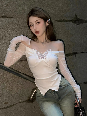 Elevate your style with a touch of Asian romance with our short off-shoulder T-shirt, adorned with a delicate butterfly appliqué. This top is designed to capture the essence of a refined and contemporary aesthetic and is a true embodiment of tenderness and elegance. Made from a soft, comfortable knit fabric, this white T-shirt gives you a seductive silhouette and an airy look. The centerpiece of attention is undoubtedly the large embroidered fabric butterfly appliqué that adorns the neckline. It is sheer to let your skin subtly peek through and invites dreams and poetry. The long sheer mesh sleeves add a mysterious touch, while the crop-top style reveals just the right amount of your waist for a look that is both innocent and boldly fashionable. Perfect for summer gatherings or evening outings. Pair it with casual jeans or a high-waisted skirt for a striking contrast.