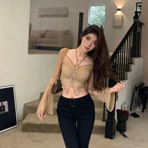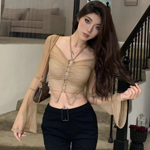 This grunge T-shirt for women has been pulled straight from the depths of rebellious and daring fashion, and is a masterpiece that will excite lovers of alternative styles. This top expresses the perfect balance between seduction and character, featuring long, sheer sleeves that play with the secrets of light and shadow. The color passion red, representing strength and self-confidence, envelops this crop top, making it a must-have for anyone daring to emphasize their style. The intricately crafted top has a charming neckline highlighted by lacing, inviting individual design of the silhouette. The delicate lace insert at the bottom adds a refined feminine touch. This T-shirt is ideal for drawing attention at concerts, nights out with friends, or other occasions that require a hint of boldness. It is the centerpiece of a look that leaves no one untouched. Pair it with form-fitting high-waisted pants to create contrasts and underscore your unconventional personality.
