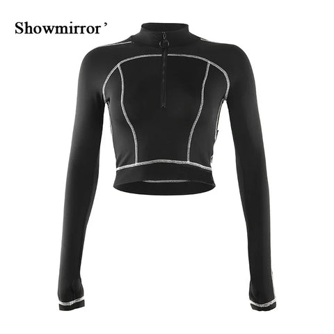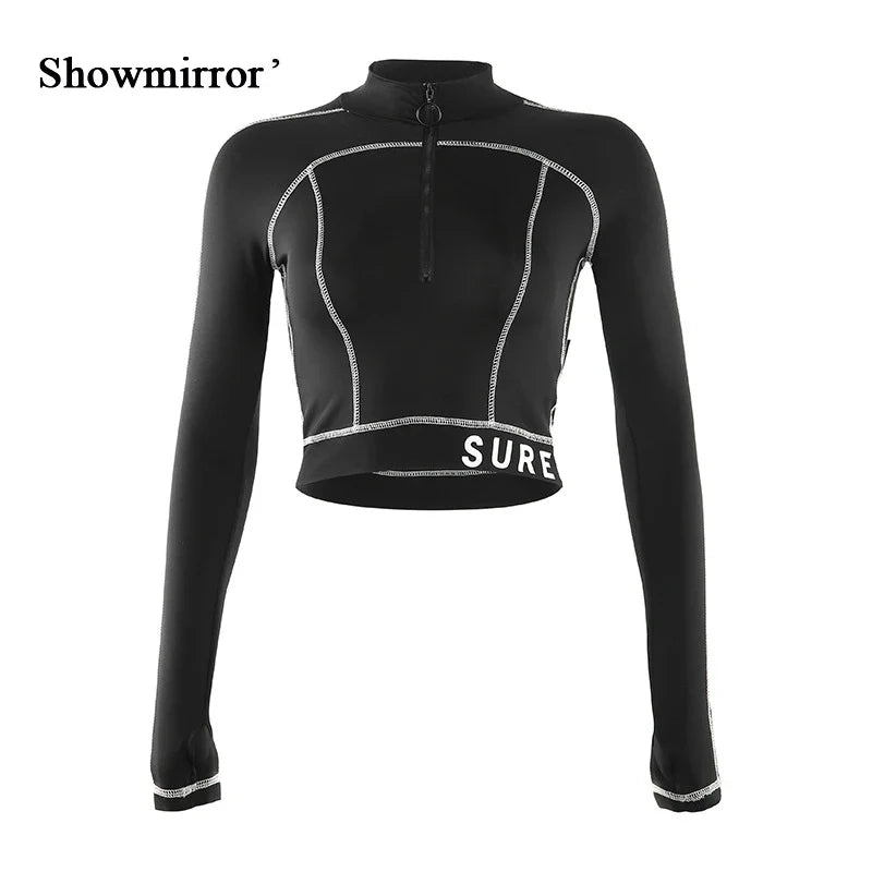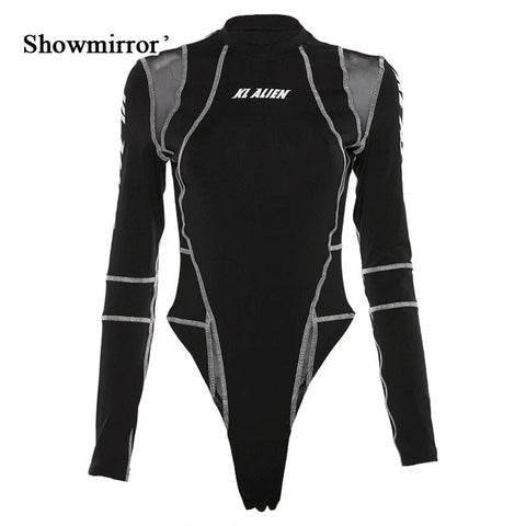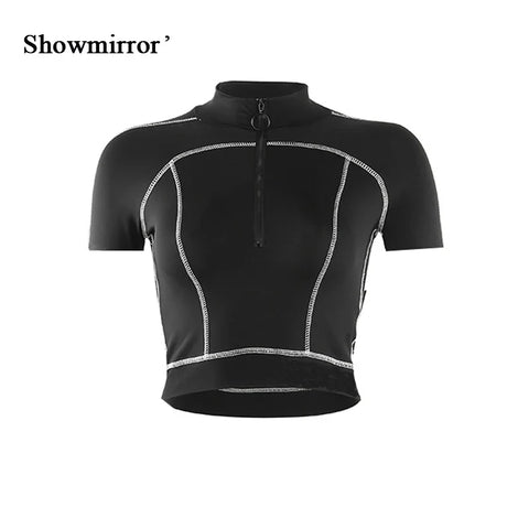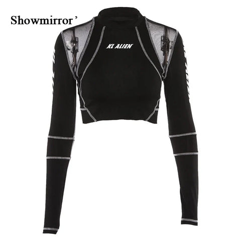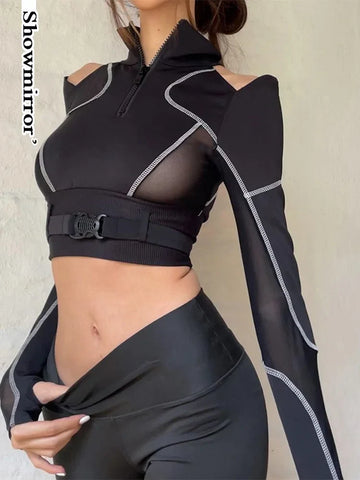 Discover the must-have of the alternative wardrobe: the Techwear Biker Wear Mesh T-shirt, the perfect piece of clothing for those who love Gothic and Urban style. This bold, short black top features strap and buckle details that underscore a rebellious and modern attitude. Made from a smooth, stretchy black fabric, this top offers both comfort and style. Subtly arranged mesh inserts give it a touch of originality and sensuality, allowing your skin to breathe. The contrasting white trims along the sleeves and shoulders precisely outline the contours and highlight the dynamic look of the garment. The stand-up collar with zipper adds a touch of biker atmosphere, while the open shoulders and long sleeves with cut-outs give a hint of boldness. The cropped length of this top emphasizes the silhouette and is perfect for pairing with high-waisted pants or a skirt for a trendy look with attitude.