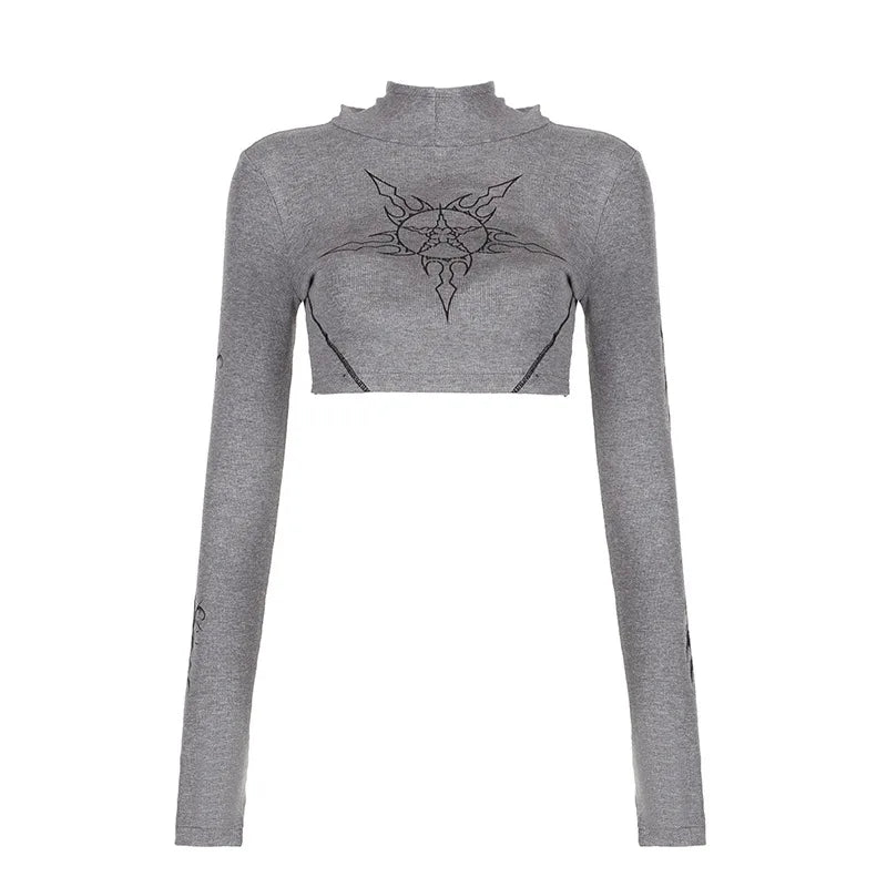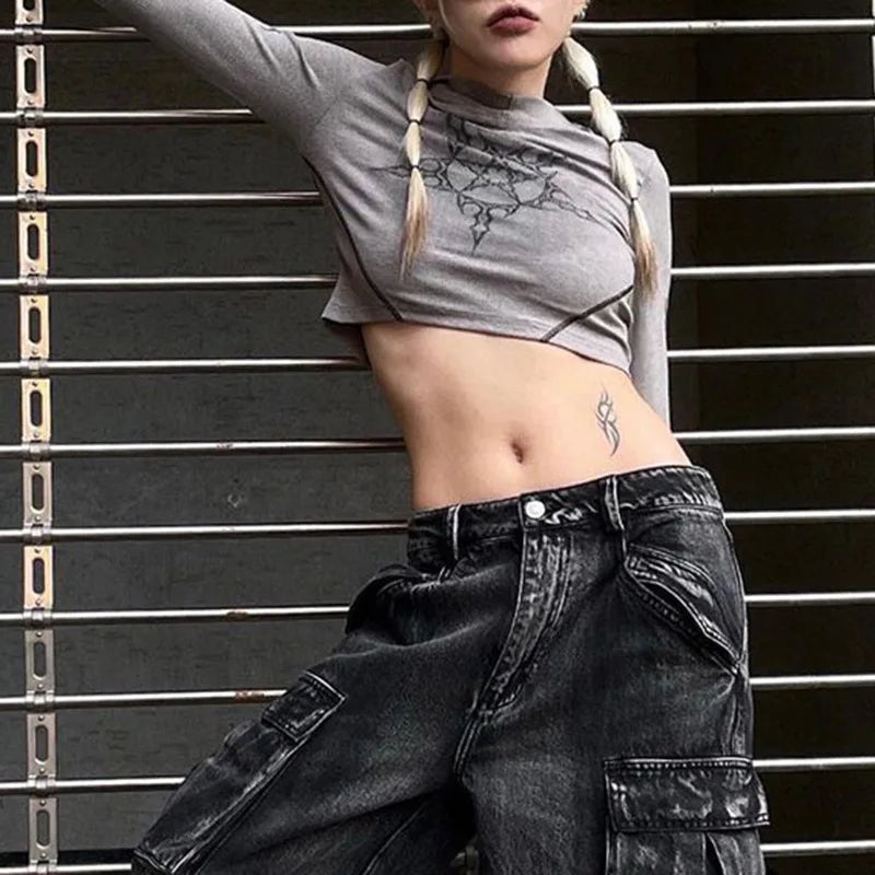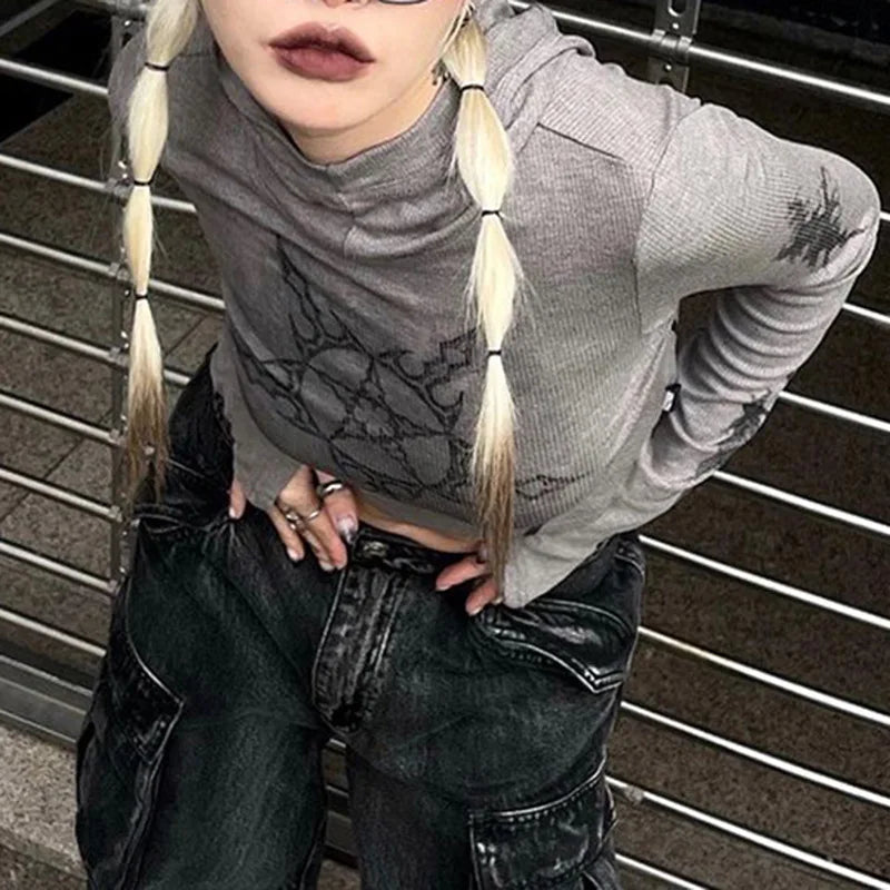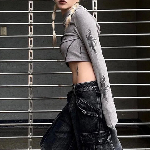 Dive into the rebellious essence of the 2000s with this vintage crop top with a hood, a must-have for any Y2K fan. This charcoal top is designed to capture the bold and laid-back spirit of the turn of the millennium, and it’s the perfect piece for those who want to showcase a casual yet avant-garde style. The crop top is adorned with a printed spiderweb, recalling the mystical and alternative aspect, adding a subtle gothic touch to any outfit. Its short, loose cut perfectly balances comfort and sensuality, revealing just the right amount of skin. The long sleeves and hood add a practical layer for cooler evenings while maintaining the distinctive streetwear aesthetic. Paired with low-rise jeans or black leather pants to play with material contrasts, this crop top will draw attention and position you as a pioneer of underground fashion. Whether the authentic style of the 2000s is second nature to you or you want to experiment with your wardrobe, this vintage crop top with a hood is the definition of alternative chic. Step boldly into the Y2K era with a touch of nostalgia.