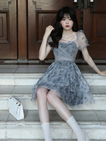 Magical Kawaii Lolita Summer Dress with Puff Sleeves in Gray