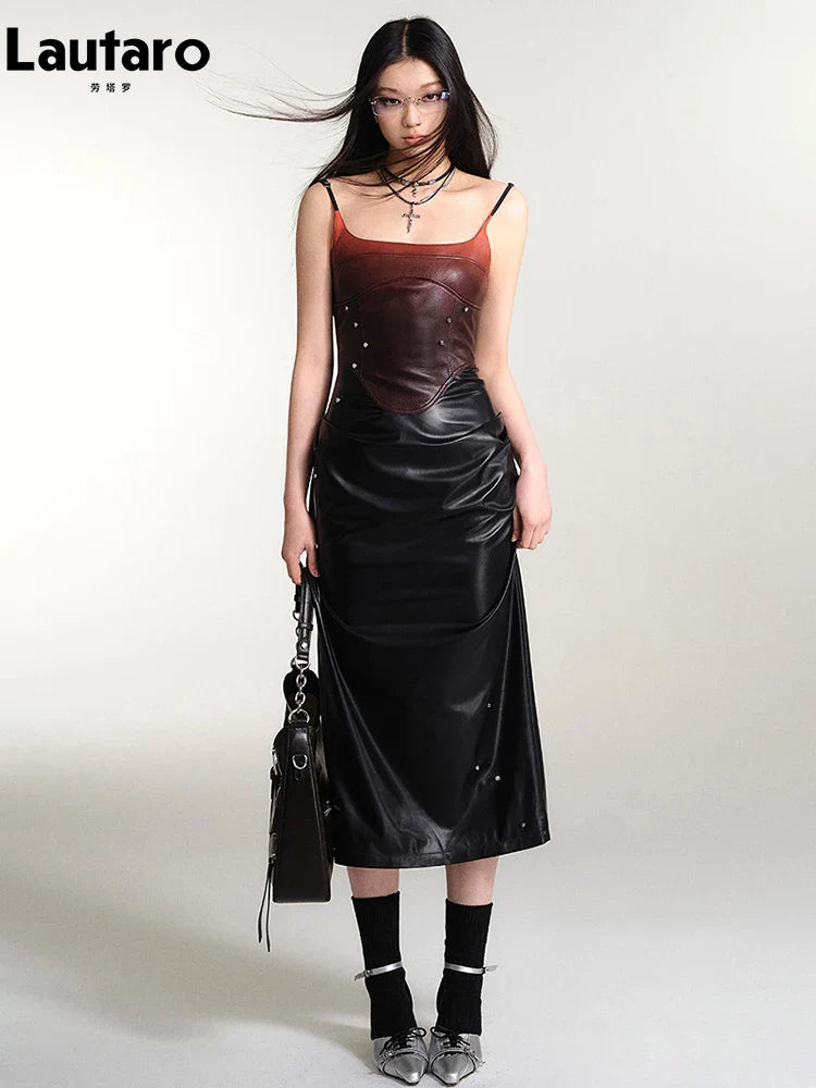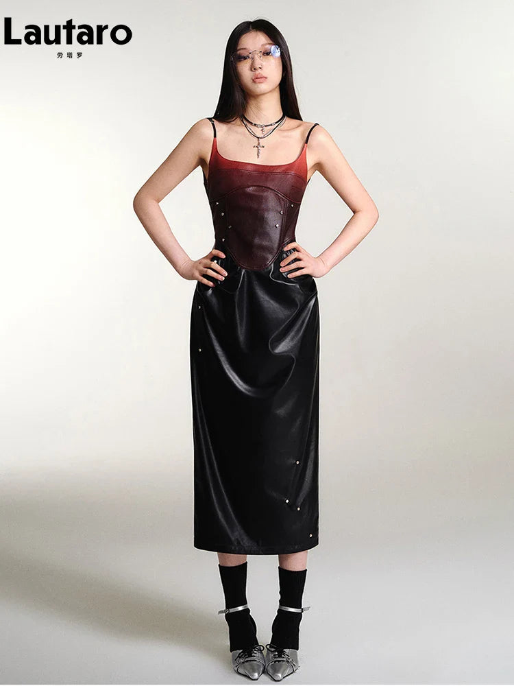 Discover a fresh spring breeze in the world of alternative fashion with this captivating mid-length dress that merges boldness and elegance. This dress is designed for women who dare to stylishly challenge conventions. It ignites the imagination with its unique gradient that brings a mysterious look to life. The snug corset made of black and burgundy faux leather envelops your silhouette with sophistication, while the slim spaghetti straps add a delicate, feminine touch. Every detail is designed for sublimation: subtle metal rivets provide a rebellious and chic dimension, playing with the light to draw attention. The skirt made of the same material features a midi cut that emphasizes the length of the legs and perfectly harmonizes with the top, creating a seductive second-skin effect. The daring halter insert is just right for radiating enigmatic seduction.
