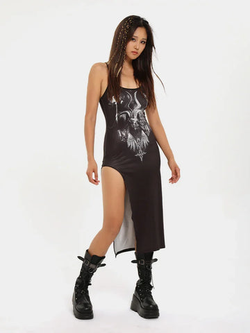 Discover the essence of a Gothic summer with our alluring halter dress featuring a magical neck motif and undeniable charm. This unique garment, crafted to elevate your summer evenings, embodies the perfect balance between mystique and sensuality. Our dress combines comfort with alternative aesthetics and boasts a captivating sheep totem print that immerses you in a world of darkness and fantasy. The deep black of the dress creates a striking contrast against the skin, while the halter neck design reveals a bold and confident silhouette. With an asymmetrical hem and side cutouts, this outfit reinterprets the classic black dress with a rebellious touch. It has been designed to accompany your movements gracefully and fluidly, ensuring a magnetic presence with every step. This dress is not just a piece of clothing; it is an allegory of the night, a hymn to the free souls who dance under the stars.