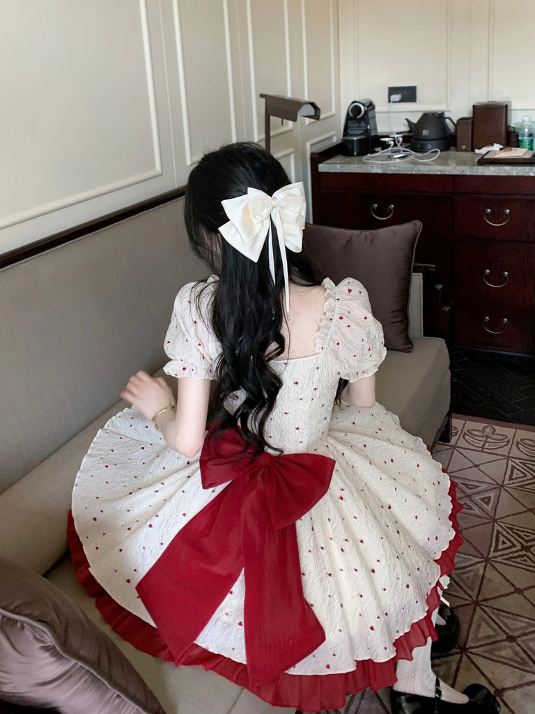 Immerse yourself in a sweet world with our charming Women's Mini Dress Bow Lolita Kawaii. This airy-light model in a lovely cream tone captivates with its bright red heart pattern, giving you freshness and romance. The lightweight puff sleeves add a playful touch to the dress, while the tailored cut gently accentuates your silhouette. The dress is made from high-quality polyester and feels creamy while also ensuring excellent wearing comfort.
