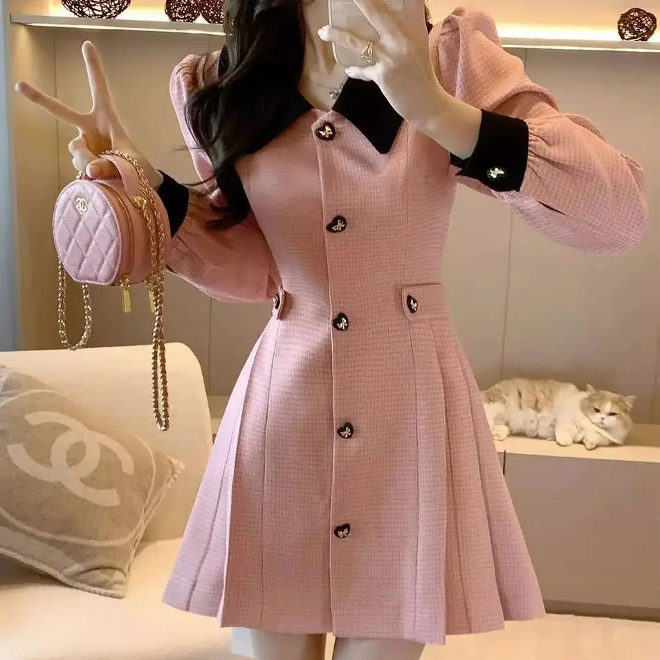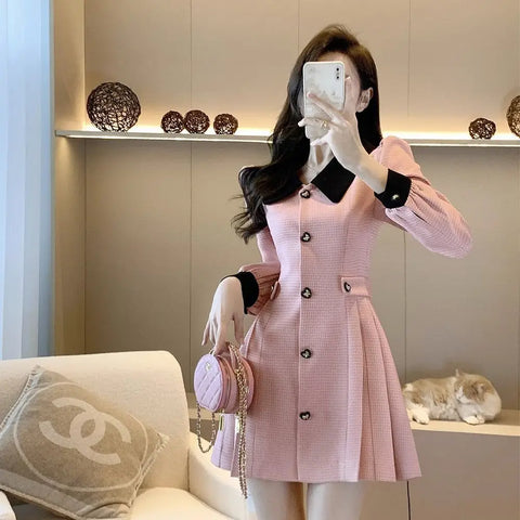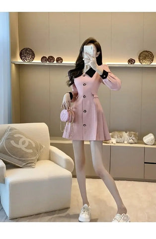 Pink Tweed Dress in Soft Girl Style with Black Lapel