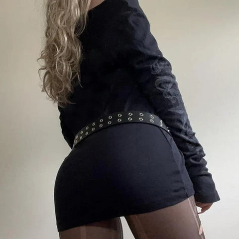 Dive into the world of alternative fashion with this seductive minidress that combines vintage E-Girl aesthetics with a decidedly trendy Gothic touch. The black dress, sublimated by a large gray star print in the center, is a call for self-expression and flirts with the mysteries of the night and the rebellious spirit of underground style icons. Made from a soft, stretchy fabric, this piece offers a comfortable fit and a flattering fall. Its long sleeves end in delicate ruffles, giving the sharply tailored silhouette a playful character. The off-the-shoulder cut boldly highlights the neckline, connecting to the discreet sensuality of the 90s and early 2000s. This minidress is versatile with a belt adorned with metal studs, adding a rock detail to the whole.