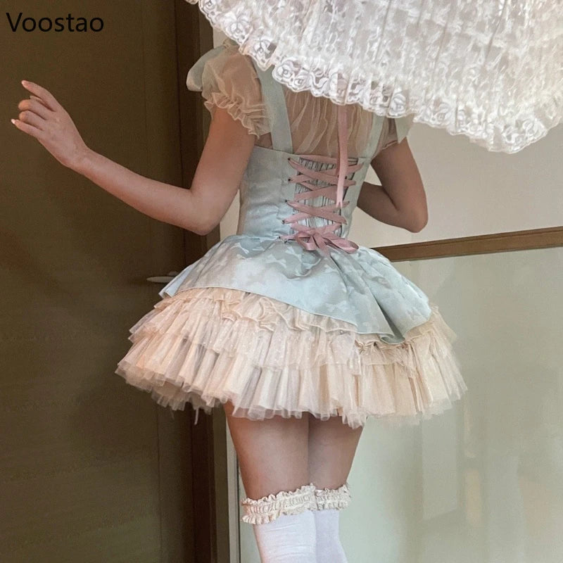Discover the sublime Sweet Lolita dress that embodies the delicacy and enchanting charm of Japanese aesthetics. This piece is in soft light blue and cream tones, combining elegance and wonder. With its fitted silhouette and puffed sleeves adorned with pink satin bows, every detail is perfectly thought out. Far from being just a simple dress, it is a true experience!