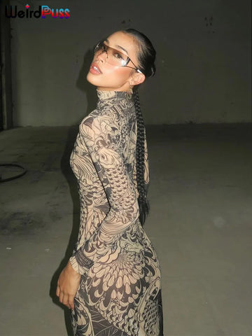 Immerse yourself in the Y2K era with this form-fitting maxi dress that reflects the boldness and uniqueness of your style. Perfect for lovers of the alternative scene, the **Mesh Maxi Dress with Weird Puss Print** is a must-have for your colorful outings. Equipped with a stand-up collar and long sleeves, this versatile garment combines comfort and trend awareness. The intricate pattern in shades of black and gray adds an artistic, gothic dimension and envelops you in an abstract floral motif that is sure to turn heads. The figure-hugging cut gracefully accentuates your curves and subtly highlights the silhouette, all while maintaining comfort thanks to the breathable and stretchy mesh fabric. Refine your look with captivating accessories like futuristic glasses and daring jewelry to reflect the free spirit of the 2000s.