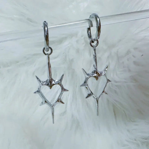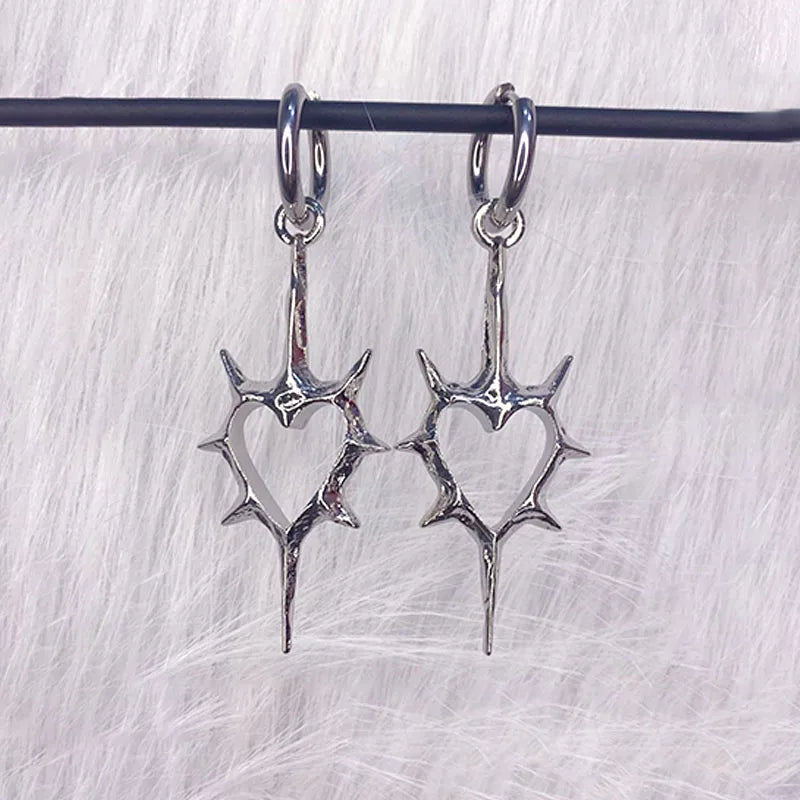 Capture the essence of alternative style with these beautiful, Korean fashion-inspired Spiky Heart Earrings. These earrings are an essential accessory for any gothic lover, characterized by their bold design and delicacy, perfectly encapsulating the rebellious and romantic spirit. These metal jewelry pieces feature a heart surrounded by sharp spikes, reminiscent of the enchanted roses in a gothic garden. Each earring elegantly hangs from a metal ring, adding a touch of sophistication to their wild appearance. The shiny alloy attracts the light, giving the hearts a presence that will inevitably turn heads. With their lightweight design, they are comfortable to wear all day or night during nighttime outings.
