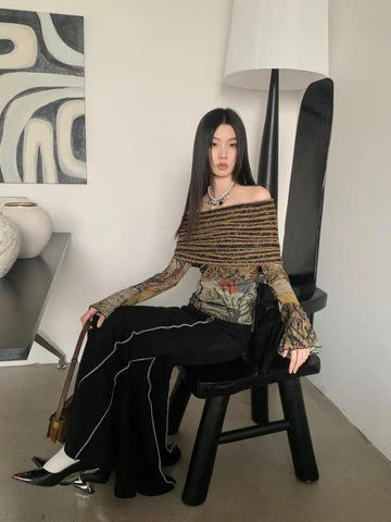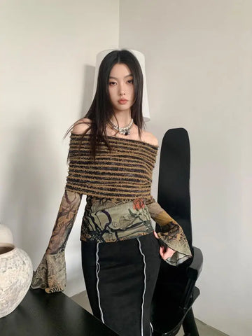 Discover our Off Shoulders T-Shirt with long sleeves, designed for bold souls who love alternative fashion. This unique model combines indie folk style with a modern touch and a ruffled sleeve design that stands out for its originality and feminine look. Made from a soft material blend, this T-shirt offers exceptional comfort and flatters the silhouette. The top features rich textures in natural tones that create a handmade effect guaranteed to draw all eyes. Let yourself be captivated by the mysterious, artistic print that evokes a boho-chic atmosphere suitable for all occasions, from casual outings to elegant evening events. Pair it with a leather skirt or fitted pants for a look that merges elegance and rebellion. This T-shirt is more than just a garment - it is a style statement for anyone daring enough to stand out from the crowd. Embrace the alternative spirit and showcase your personality!