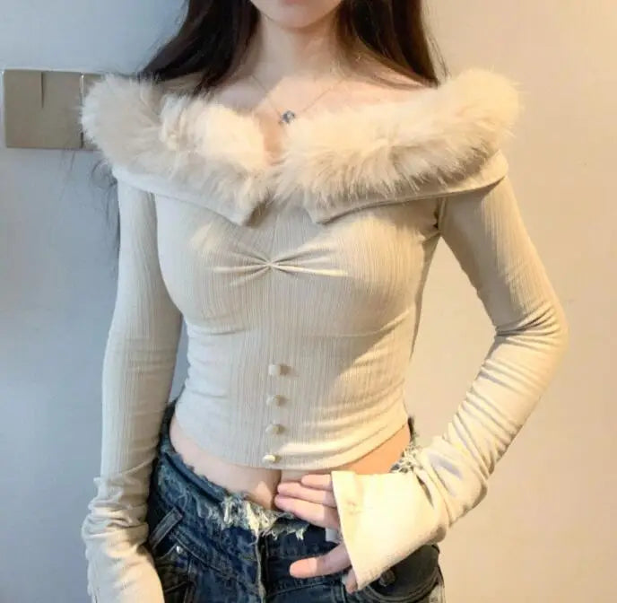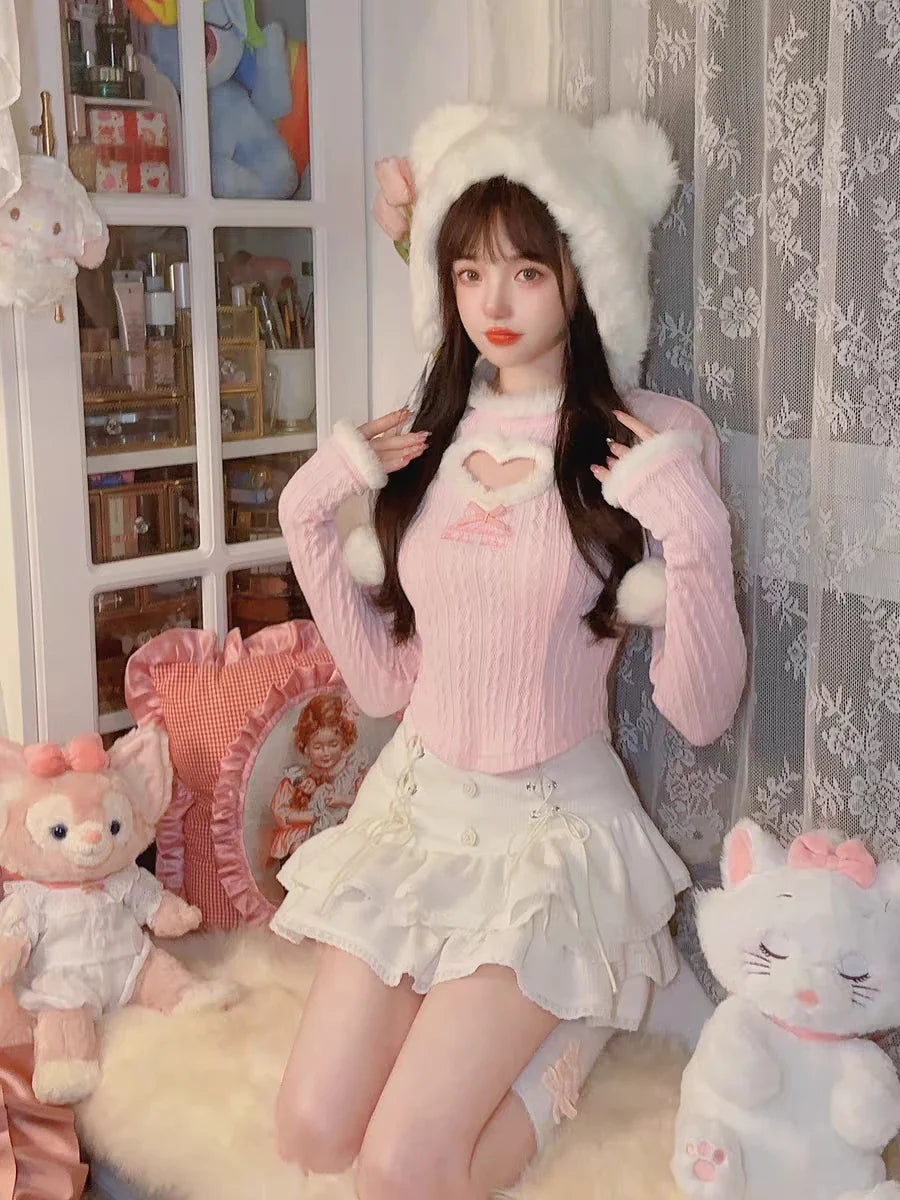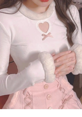 Dive into the sweet and enchanting world of Lolita fashion with our stunning Kawaii blouse in shades of pink and white. This highlight combines innocence and alternative style for a breathtaking effect. The blouse in heavenly white with delicate pink is adorned with a large, cut-out heart on the chest that invites daydreaming. The Claudine collar with soft, white faux fur adds elegance and charm. The long sleeves with cuffs, also made from faux fur, perfectly complement the warm design of the top. The finely crafted knit resembles delicate craftsmanship, while the small ribbon bow under the heart adds a touch of femininity. The equally important skirt features a high waist with decorative buttons and lacing, reminiscent of the corsets from the Victorian era.