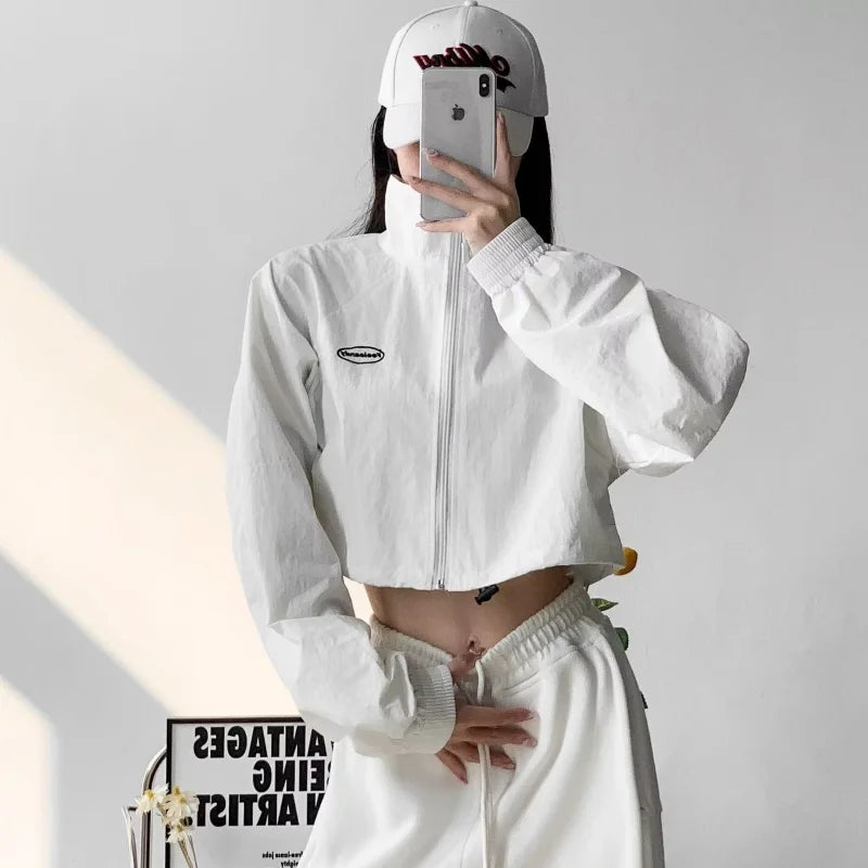 White Zippered Windbreaker with Black Logo Crop Women Style Techwear