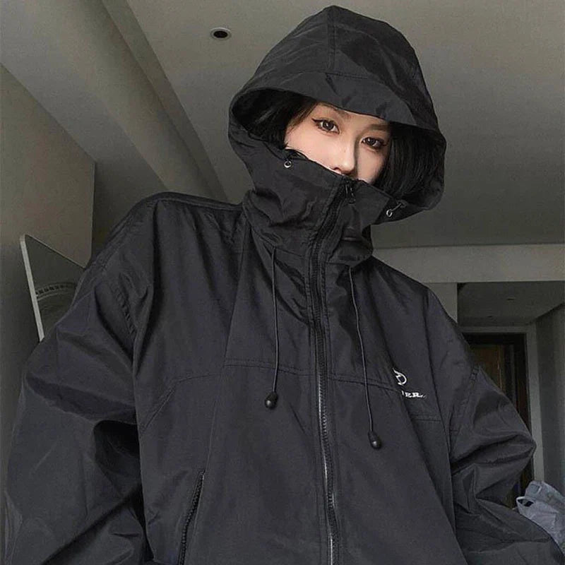 With our Gorpcore jacket with a hood, where functionality and style meet in deep black, you can explore the urban wilderness. This oversized coat in a relaxed silhouette combines cozy comfort with trendy aesthetics, making it perfect for autumn escapades. The jacket is designed for those who value both performance and attitude. It features a drawstring hood and a refined full-length zipper so that you are prepared for any element. Enjoy the spacious, long sleeves made from lightweight yet durable material that provides just the right warmth without bulk. Subtle details like effortless side pockets enhance practicality. The simple yet strong aesthetic is further emphasized by the minimalist lettering and stylized embroidery on the chest, combining a sporty aspect with street-smart flair.