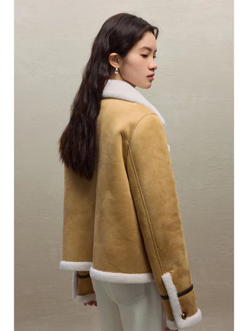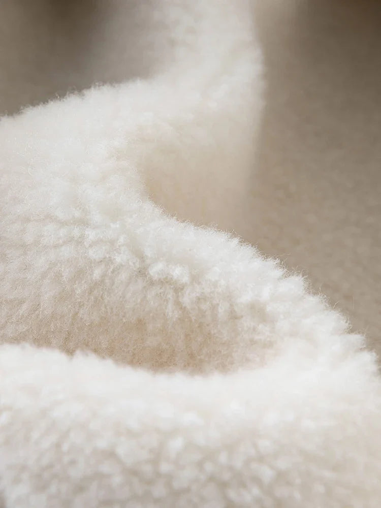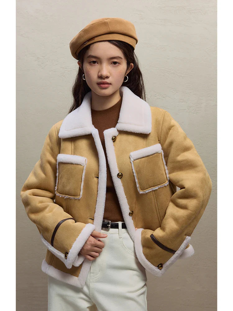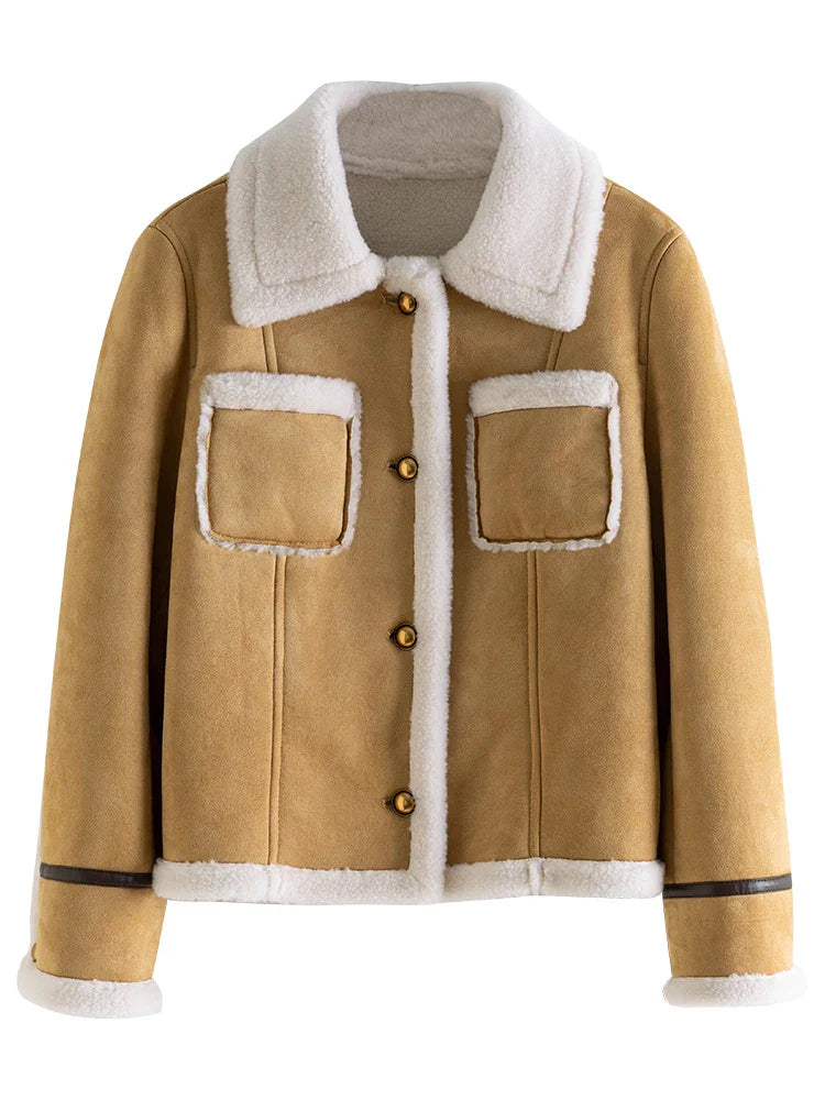 Dive into winter with this beautiful short jacket made from 100% lambswool. It is perfect for adding an alternative touch to your wardrobe. The warm khaki color and the details of white faux fur combine comfort with a cheeky style. The turned collar and the front pockets provide a retro touch while being practical at the same time. The design keeps you warm without compromising the look: Elegant gold buttons complete this unique piece. Pair it with a basic T-shirt and jeans for a casual look or with a skirt for a more elegant appearance.