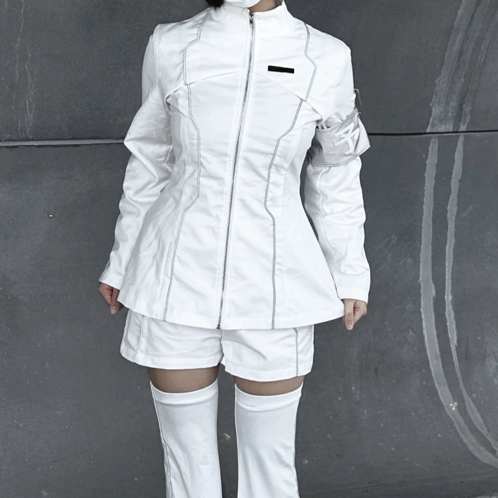 Awaken the fashion worker in your mind with this incredible zip-up jacket from the Y3K subculture series, designed to emphasize your presence while embodying a bold mechanical style. Crafted with great attention to detail, this cool piece merges sophistication and rebellion, providing you with the perfect mix of trend and originality. The minimalist design in white exudes a futuristic vibe, while the accentuated seams add a touch of subversive elegance.