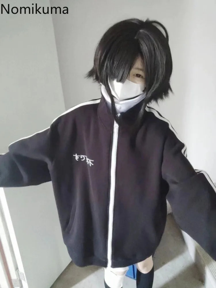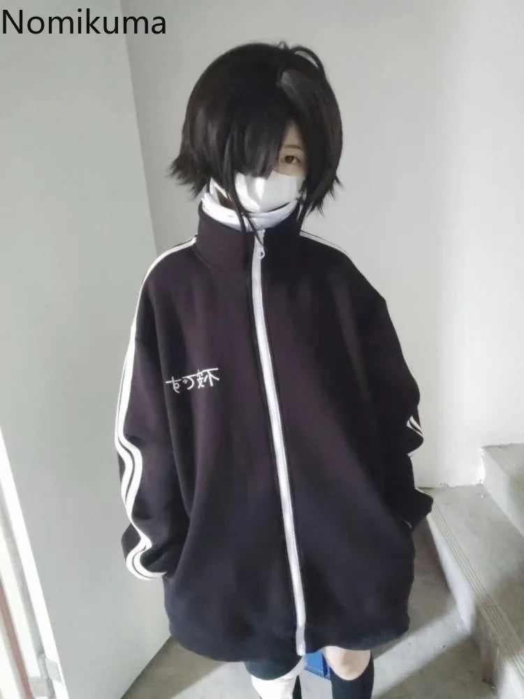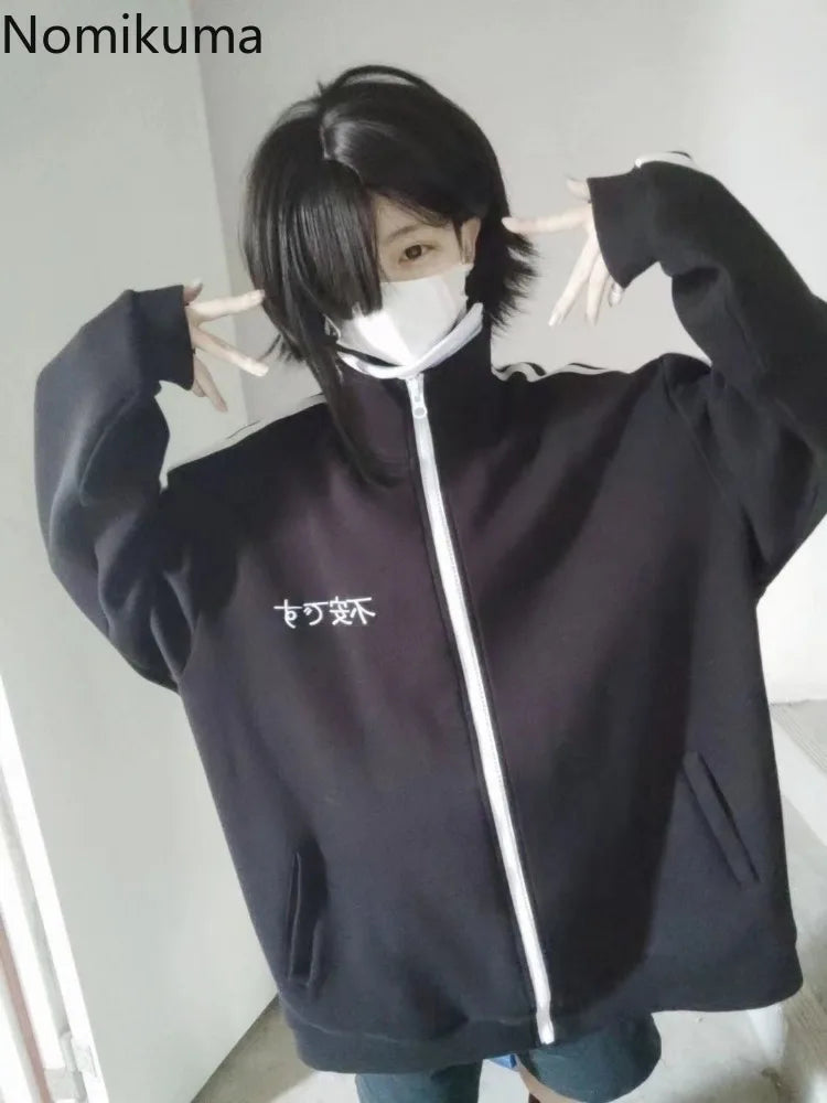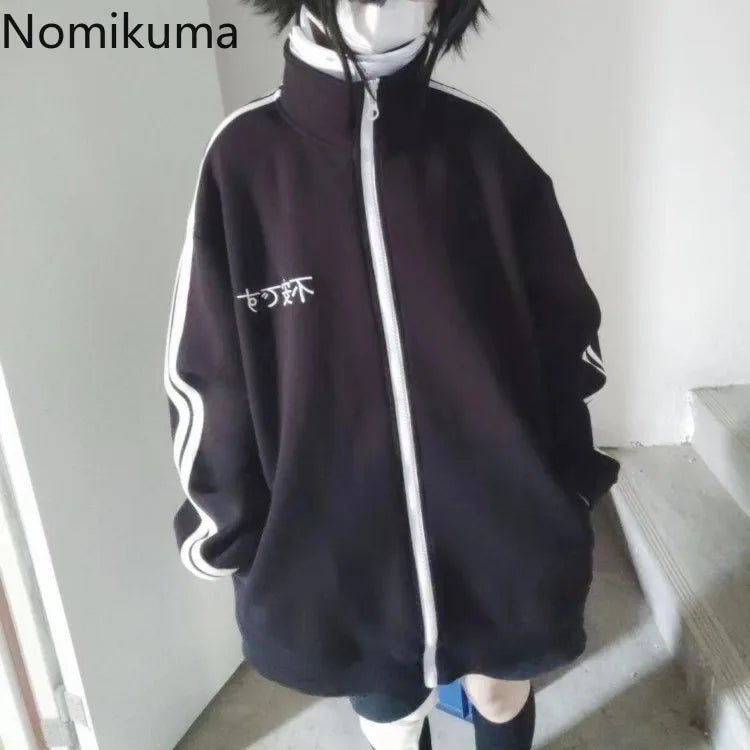 Discover our Japanese Jacket Preppy Style for ladies, the perfect choice for anyone who wants to combine comfort and style. This jacket made from soft, breathable fabric with a stand-up collar features a zipper closure and offers a casual yet fashionable look. Its simple design, highlighted by sporty details such as side stripes, makes it an essential part of your alternative wardrobe. Whether you're out and about in the city or meeting friends, this jacket adapts to any occasion and ensures you feel extremely comfortable. With its oversized cut, it can be easily thrown over your favorite outfits and adds a mysterious and characterful touch to your style. The stylized lettering provides an original and distinctive note, allowing you to elegantly stand out from the crowd. Don't wait any longer and elevate your daily look with a touch of flair with this beautiful must-have piece!