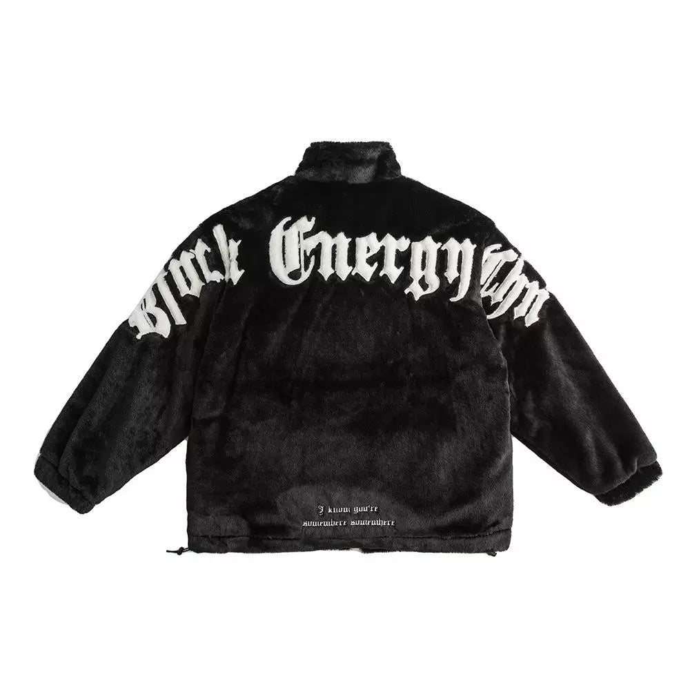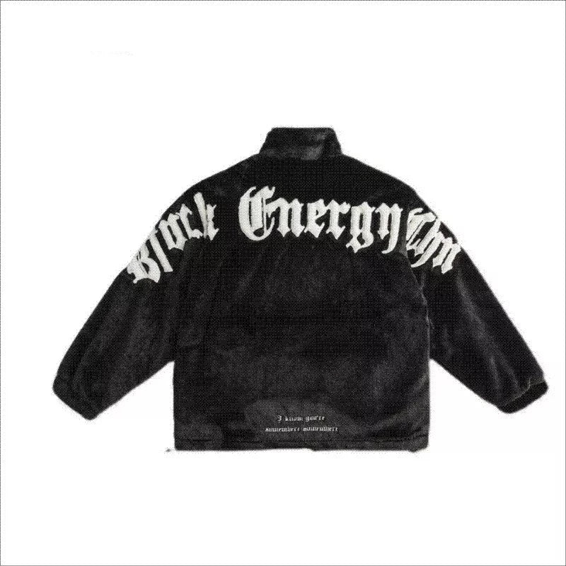 A must-have for any lover of alternative fashion who appreciates bold and comfortable pieces. Inspired by the underground movement, this jacket is not just a garment but a declaration of independence against monotony. By combining the luxury of faux fur with the subcultures of the 2000s, the jacket has been designed to make a strong impact in the urban landscape. The message "Black Energy" in Gothic letters on the back is a rallying cry for all who dare to assert their individuality. The loose fit and unisex style cater to both men and women, evoking a sense of freedom and fluid gender norms. In the winter chill, the thick lining promises seamless insulation and cozy comfort.