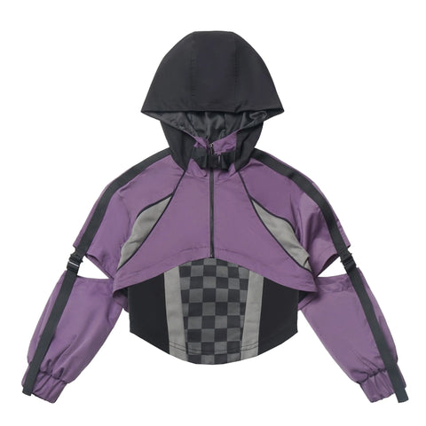 Dive into the bold world of alternative fashion with our unique set of jacket and casual pants. The futuristically inspired jacket with its striking checkered pattern in purple and black sets a cheeky trend that will not go unnoticed. The asymmetrical cut details and voluminous sleeves give the jacket a modern touch while ensuring optimal comfort. The matching pants, also in black, perfectly complete the look with their loose fit and functional pockets. Whether at a festival or in everyday life, this outfit expresses a new, unique subculture! Dare to blend comfort and bold styling and express your personality with this sensational two-piece.