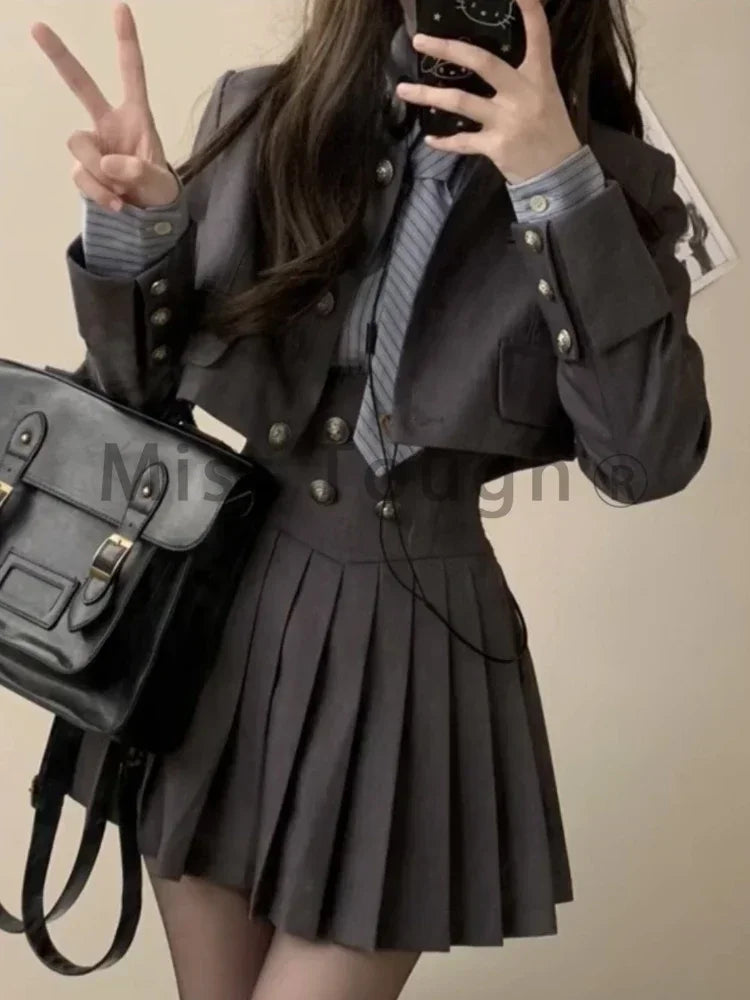 Bring a breath of fresh air to the world of alternative fashion with this three-piece women's set that embodies the perfect fusion of Japanese Kawaii aesthetics and contemporary elegance. Each piece of this ensemble is designed to create a harmonious look that skillfully blends fantasy and seriousness. Let's start with the short coat, a true gem that combines functionality and style. The fitted cut and double metal buttons add a touch of authenticity and structure. The classic collar and refined seam details make this jacket a must-have for a casual-elegant look. Inside, the striped shirt tempts with its straight lines and quilted appearance, offering youthful softness. The carefully hemmed cuffs and subtly emphasized collar give this chic casual wear piece a touch of sophistication.