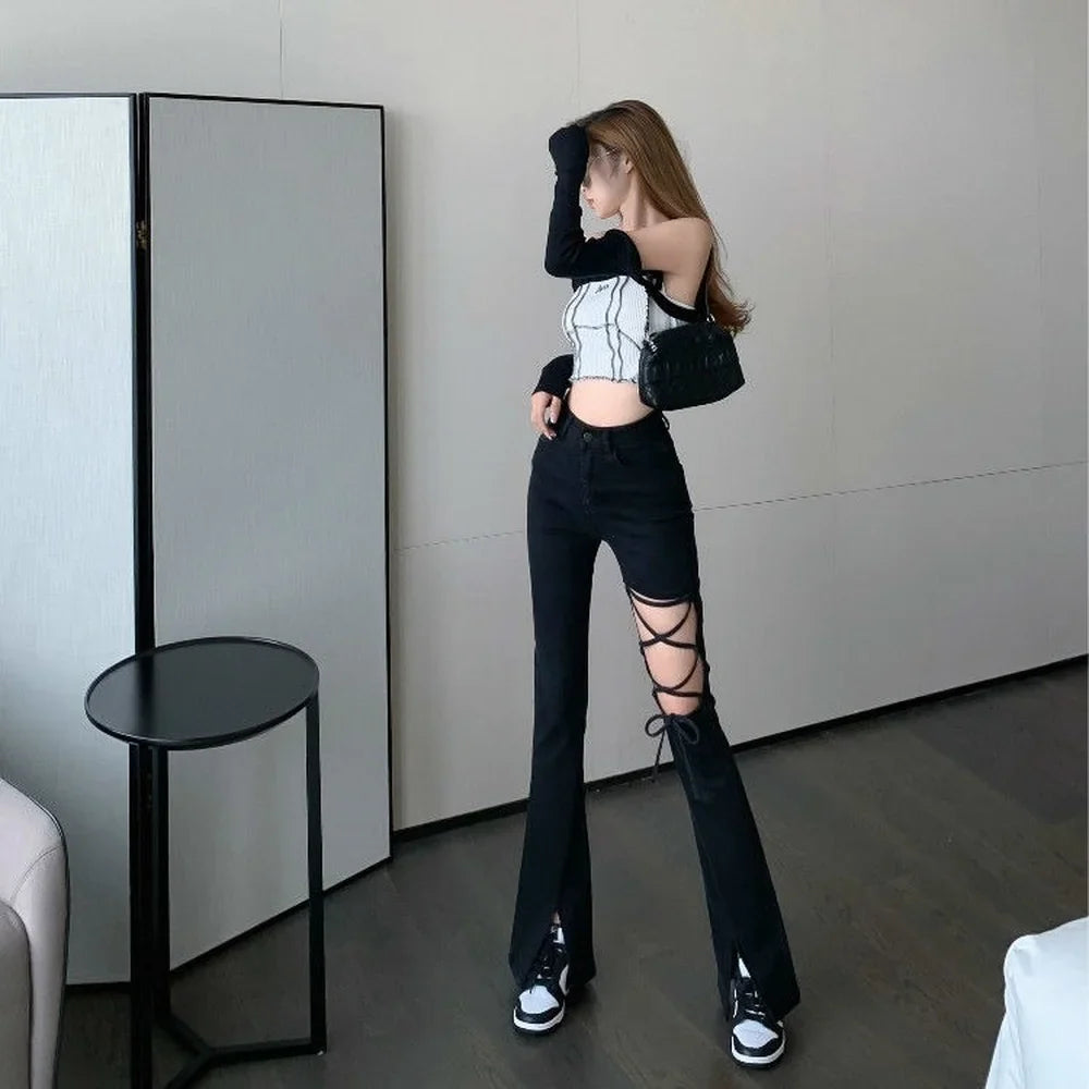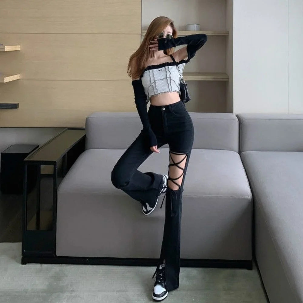 Discover the explosive mix of vintage style and rebellious look with these flared pants, which are a must-have for any alternative fashion enthusiast. These black pants made from high-quality denim perfectly fit the E-Girl aesthetic and feature unique details that will attract all eyes. The high, tailored waist accentuates your silhouette while the flared legs provide comfort without compromising on style. A bold touch is added with the strategic cutouts at the front, revealing a provocative lacing that runs across the leg, exuding a sense of freedom and audacity. Say goodbye to emotionless outfits - these pants are the epitome of self-expression. Whether you pair them with a delicate crop top or an oversized sweatshirt, these pants highlight your personality and your sense of sharp style. They are the perfect companion for outings in the city, rock concerts, or evenings with friends.