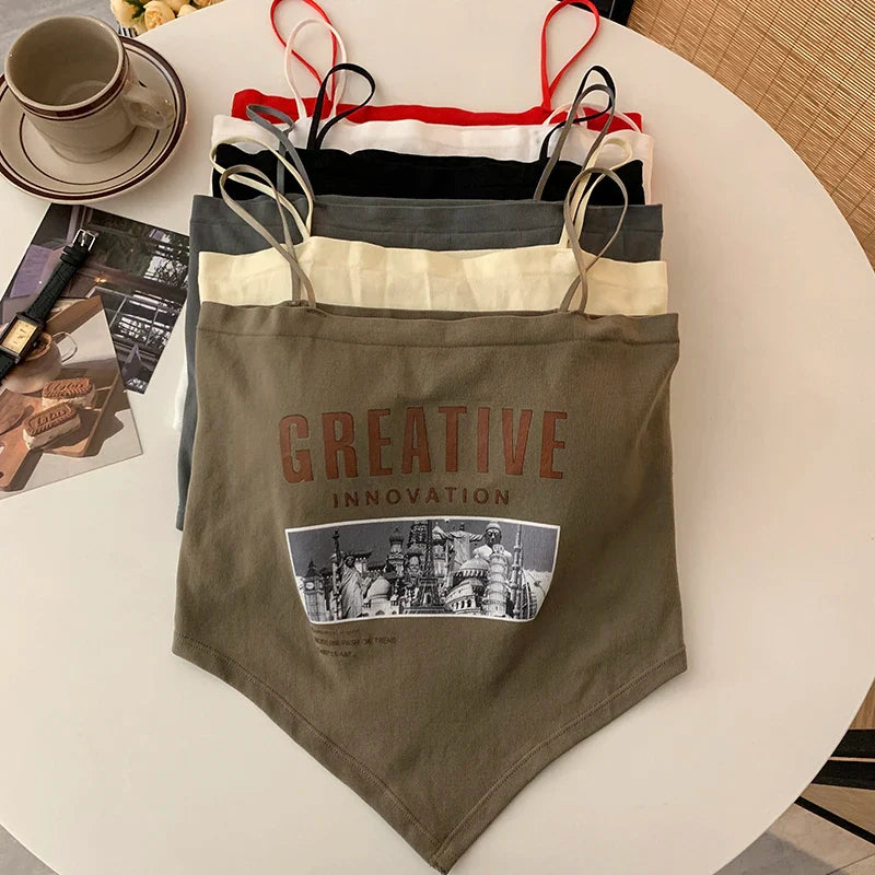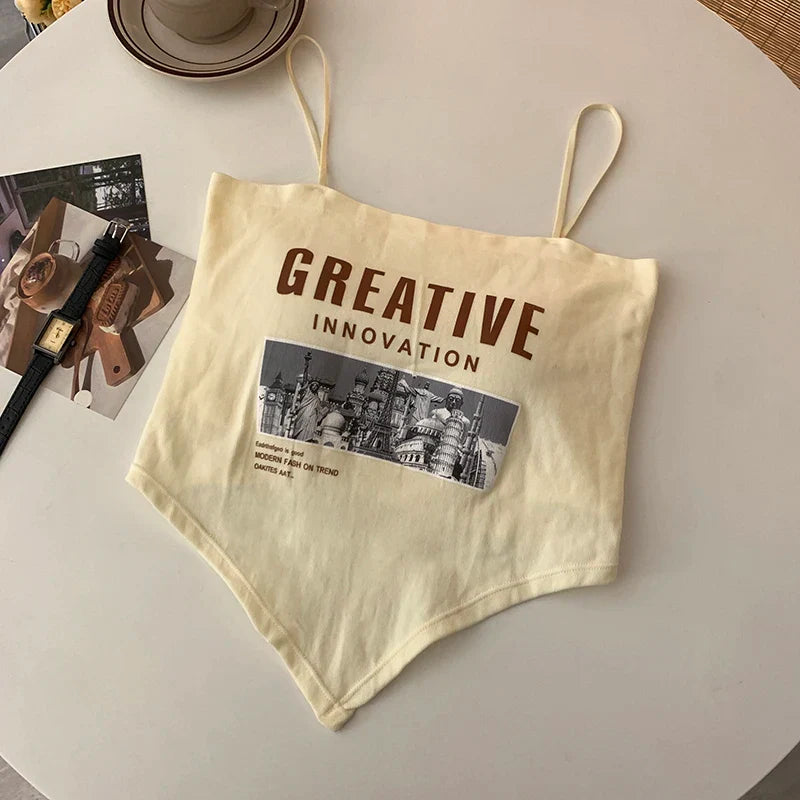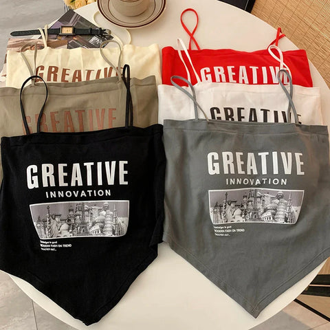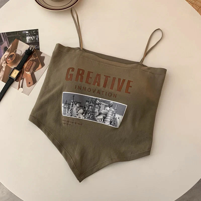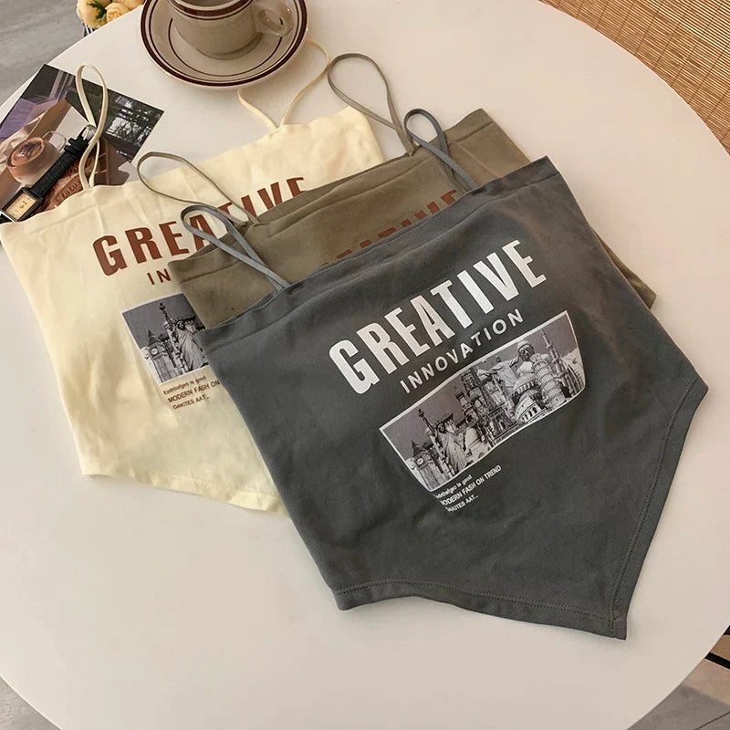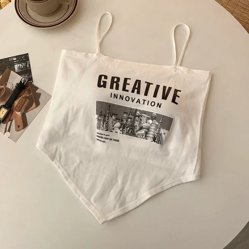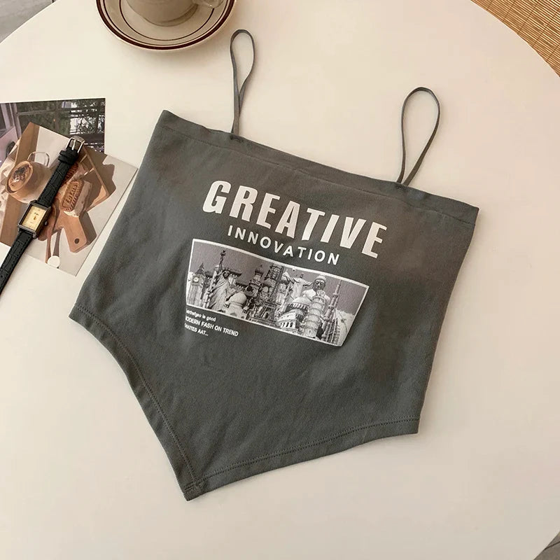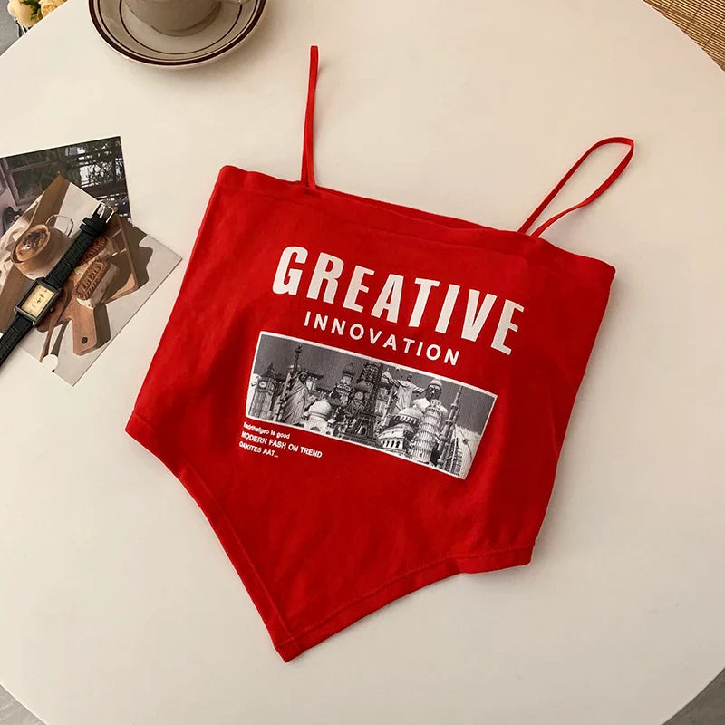 Immerse yourself in the world of alternative fashion with this elevated and daring Egirl Crop Top - perfect for anyone bold enough to express their uniqueness. The narrow spaghetti straps gently highlight the shoulders, while the short, snug fit accentuates the silhouette with a hint of asserted sex appeal. Each top is made from a soft, comfortable fabric and features a bold letter print proclaiming "CREATIVE INNOVATION," along with a captivating vintage illustration that inspires authenticity and retro flair. Available in a rainbow of selected shades - from passionate red to timeless black to delicate white, gray, and beige tones - there is a color to match every mood and moment. Ideal for a casual daytime look or a night out on the town, this versatile top pairs perfectly with high-waisted jeans or an A-line skirt to add a touch of individuality. Embrace the creative spirit and let your personal style shine with this Egirl Crop Top that is a must-have in any alternative wardrobe.