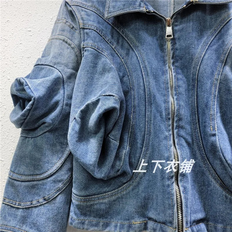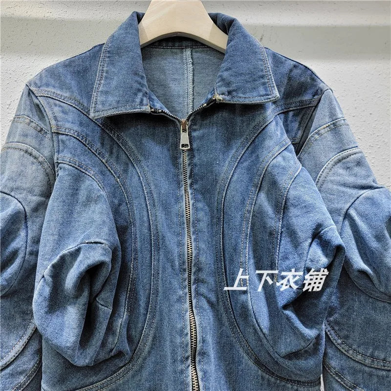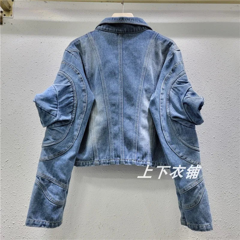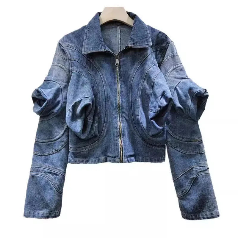 Short Blue Denim Jacket with Puff Sleeves for Women