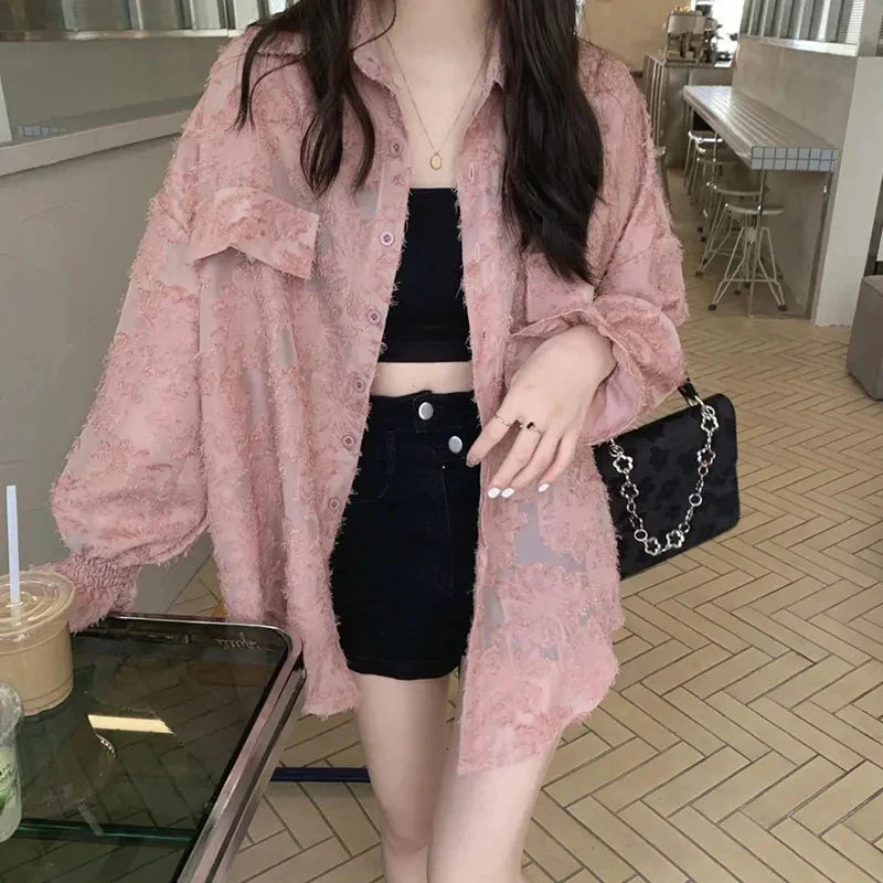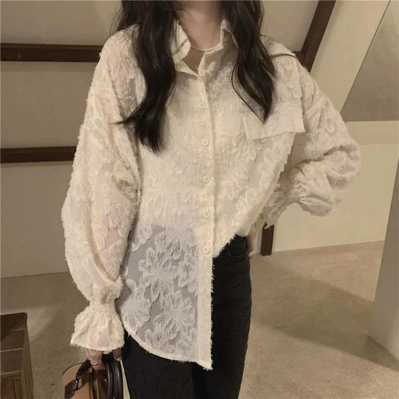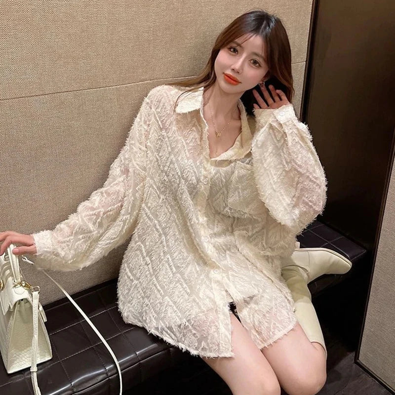 Discover our lace blouse for ladies, an essential garment for summer that combines elegance and boldness. This blouse made of lightweight, transparent fabric with fringes is ideal for sunny days. The loose fit and modern design ensure a casual yet sexy look. Whether over a swimsuit for a day at the beach or with leather pants for a city outing, this blouse is the perfect choice to express your alternative style. The ruffled sleeves and chic pattern add a touch of sophistication to your wardrobe. Get this unique piece and let yourself be seduced by its irresistible charm!