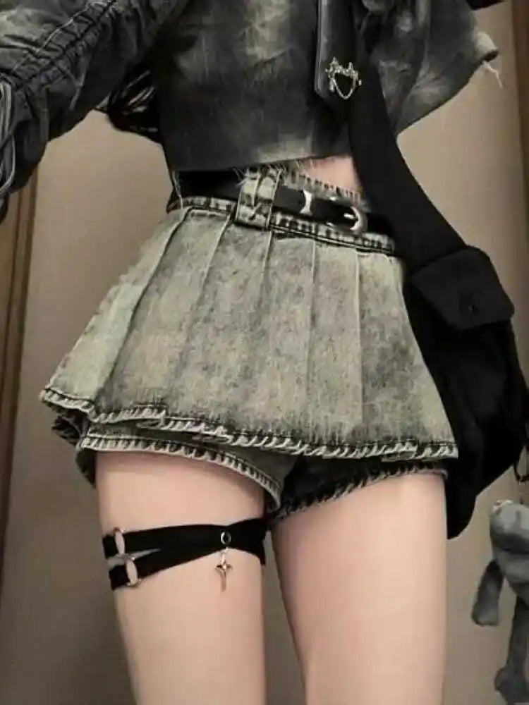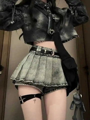 Add a touch of boldness to your wardrobe with our mini pleated skirt made of denim, specially designed for modern fashionistas! With its trendy low waist, it will accentuate your curves while being incredibly comfortable. Its durable yet lightweight denim fabric is perfect for hot summer days, while the pleated design adds a playful and dynamic look. Whether you're enjoying a coffee with friends or strolling through the city, this skirt is the perfect choice to express your unique style. Pair it with a cropped top for a casual look or accessorize it with daring items for a night out with friends. Get ready to turn heads and assert your identity - with this essential piece of the alternative wardrobe!