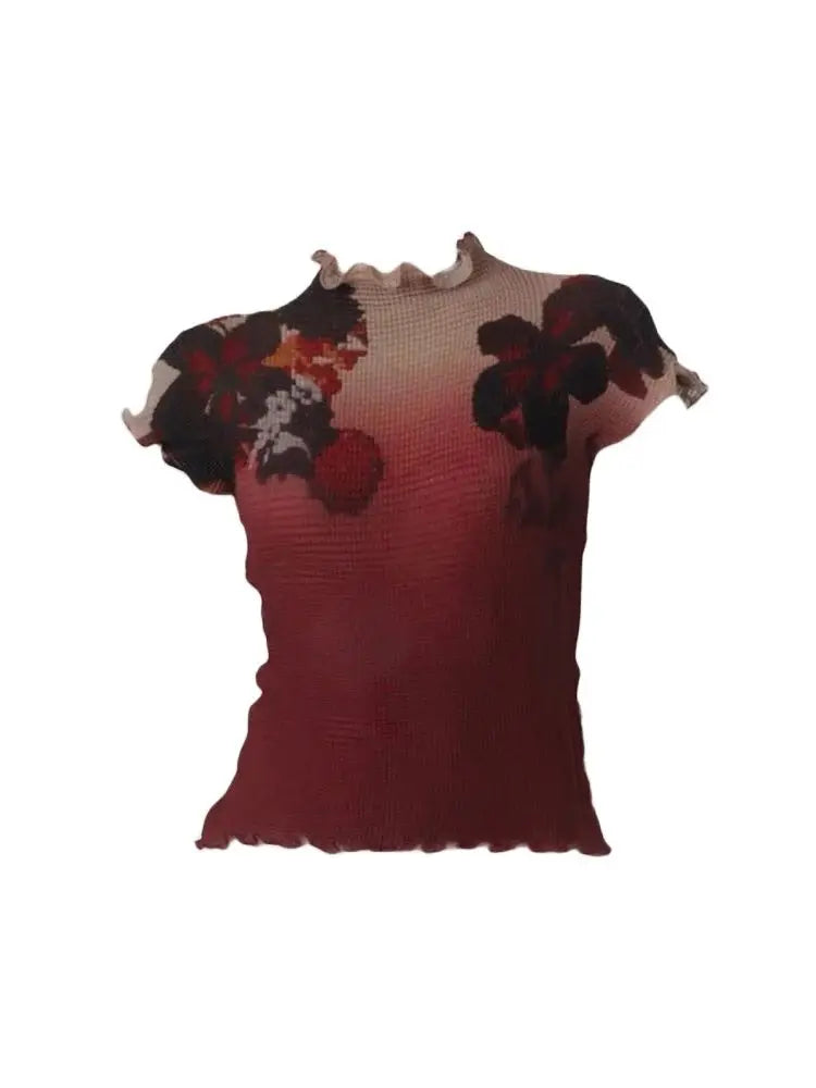 Dive into casual elegance with this uniquely styled bodycon t-shirt! Made from soft, stretchy material, it fits perfectly to your figure while allowing for freedom of movement. The delicately gathered edge and bright floral pattern add a touch of originality and femininity, making this top a must-have for anyone who likes to make a confident statement. Inspired by the ballet-core movement, the design combines vintage and modern styles and is ideal for a boho or city look. Pair it with a midi skirt or high-waisted jeans for a striking outfit. Showcase your alternative style with this t-shirt that merges comfort with poetic aesthetics!