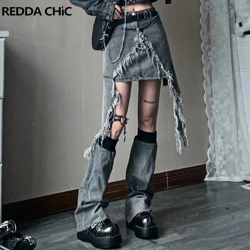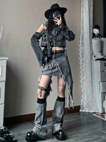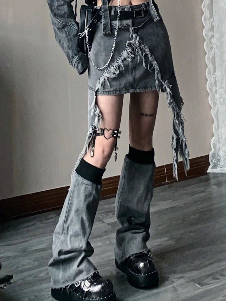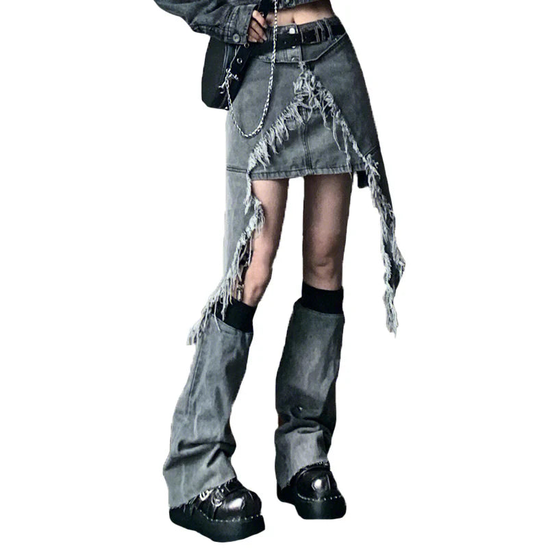 Discover stylish boldness with our Acubi Fashion denim skirt ensemble, specially designed for women who dare to stand out from the crowd. This short skirt made of gray denim features a frayed, unstructured look that adds a touch of rebellious chic to your wardrobe. The centerpiece of this ensemble is undoubtedly the unique waist belt with a metal chain that gracefully falls down the leg, adding a captivating shine to every step. Crafted from premium denim, this skirt offers the perfect balance between comfort and durability. The used effect and fraying are expressions of thoughtful nonchalance, while the removable chain gives you the option to switch it up according to mood or occasion. This ensemble is a vibrant tribute to individuality and alternative fashion, capable of transforming a simple piece into a style statement.
