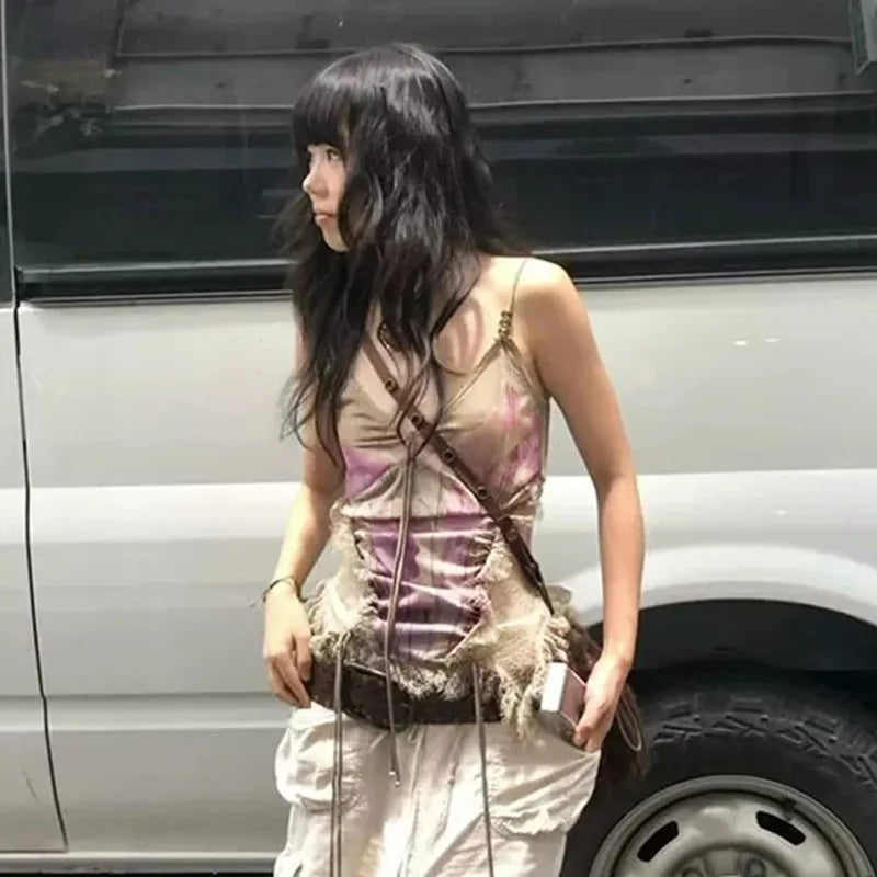 Dive into grunge fashion. This sleeveless top has been crafted with care and flair, reminiscent of a unique blend of streetwear style and colorful magic. The charming details and subtle buttons add a touch of originality, while the short cut casually yet elegantly highlights your silhouette. Whether at a festival, going out with friends, or just to express your individuality in everyday life - this tank top is the perfect choice.