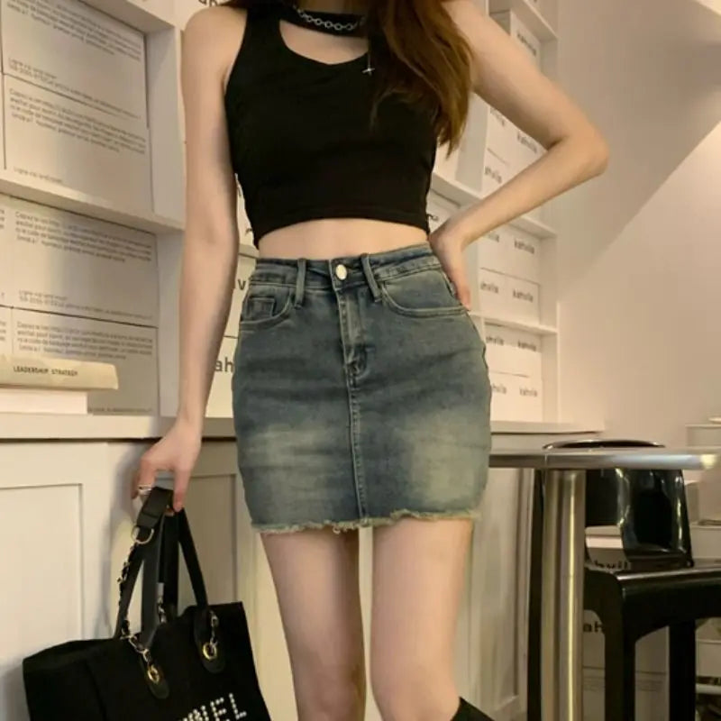 High-Waisted Fringe Mini Skirt Grunge Denim Vintage