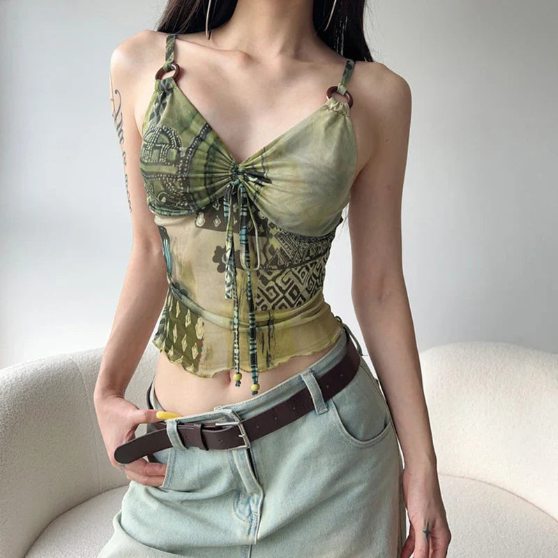 Embark on an unforgettable style journey with our green vintage-style mesh tank top! Inspired by the Y2K trend, this top is a true fashion statement that blends comfort with the style of the 2000s. With its flattering V-neckline and unique ring details, it’s perfect for showcasing your personality. Made from a lightweight fabric with a dynamic graphic pattern, this tank top adapts to all your desires.