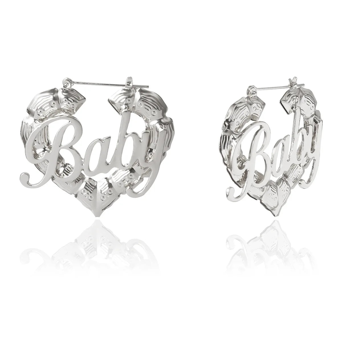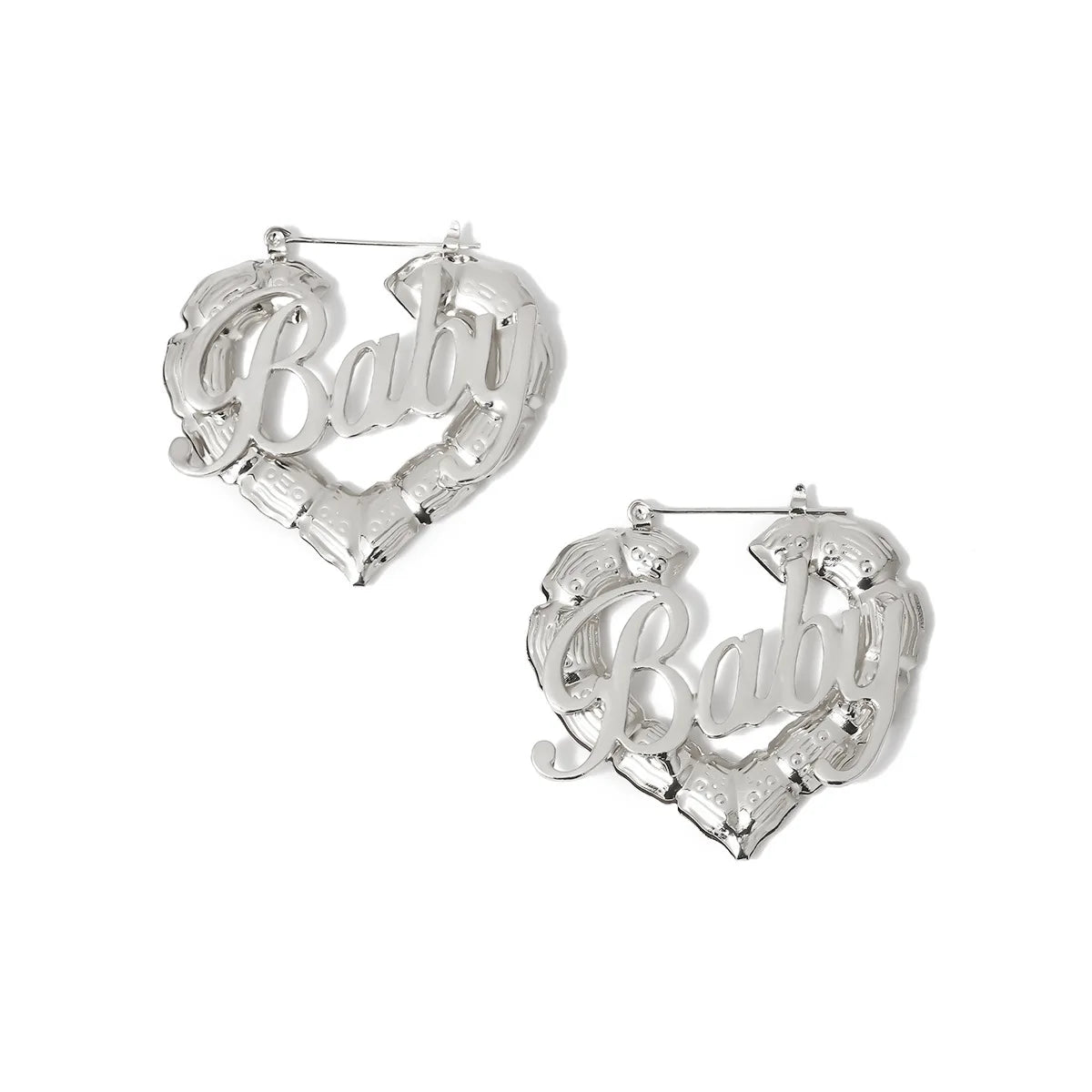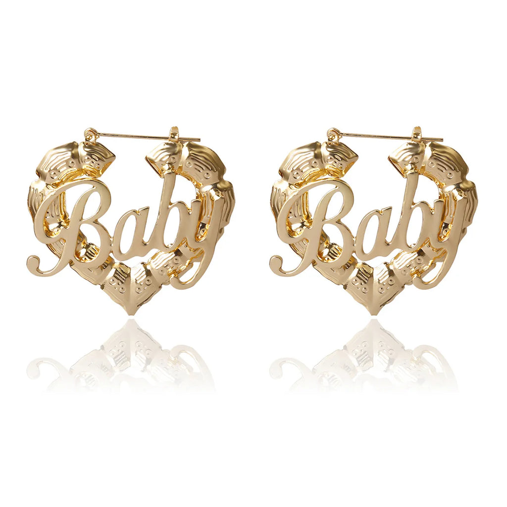 Immerse yourself in the iconic era of the 2000s with these bold earrings that capture the essence of Y2K fashion. This costume jewelry is designed to reflect a nostalgic, bold attitude and is the perfect accessory for anyone daring enough to showcase a retro and rebellious style. The earrings feature the daring shape of a large heart with the word "Baby" in stylized capital letters, reminiscent of the bling-bling trend of that time. The golden shine of the metal adds a luxurious touch, while the chiseled details catch the light with every movement, giving your look an unmatched sparkle. These earrings are ideal for accentuating an E-girl or grunge outfit with a hint of sweetness and express a confident individuality.