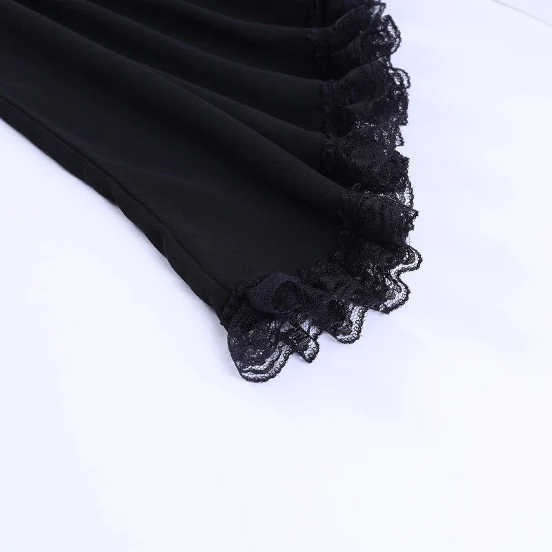 Immerse yourself in the enchanting world of alternative fashion with our Gothic blouse featuring flared lace sleeves. This must-have for the autumn season combines dark elegance with daring sensuality, creating a mysterious yet captivating look. The blouse, crafted from a blend of lightweight, delicate fabrics, highlights the cropped cut that subtly accentuates the silhouette. The flared lace sleeves add a dramatic touch, flowing with every movement for a striking effect. The floral detail at the bodice and the delicate lace trim add a romantic flair to this Gothic ensemble. Whether for an evening with friends or a special occasion, this blouse pairs perfectly with velvet pants or a long skirt to create a chic, alternative look. Awaken your dark side and reveal your unique style with this standout piece. Get ready to turn heads!