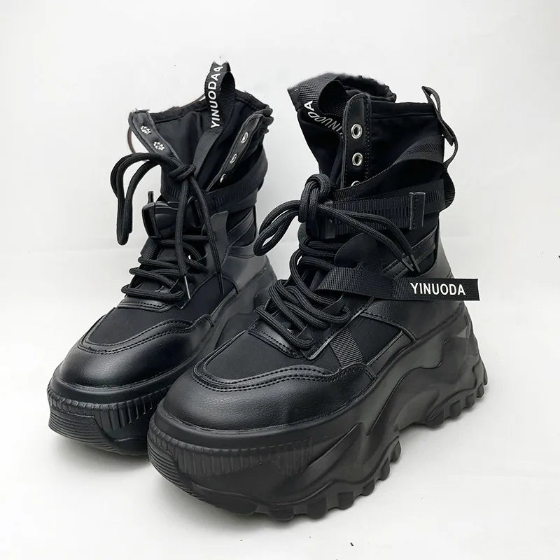 Take the step to be different with these E-Girl platform boots that combine a daring and avant-garde look. Designed for the woman who isn’t afraid to stand out from the crowd, these luxurious designer boots capture the essence of alternative fashion. Wear the strength of character on your feet with these black boots, crafted for a grand entrance. The thick platform literally elevates you above the mass, while the sturdy rubber sole promises exceptional grip and durability. Refined details such as the oversized laces crossing through shiny metal eyelets reflect a rebellious, urban style. The structured design, reminiscent of strength and boldness, is complemented by the YINUODA brand label, adding a subtle touch of distinction. These boots have been crafted with meticulous care and are sure to enhance your alternative wardrobe.