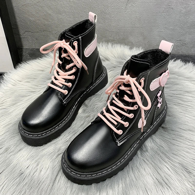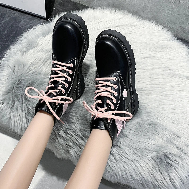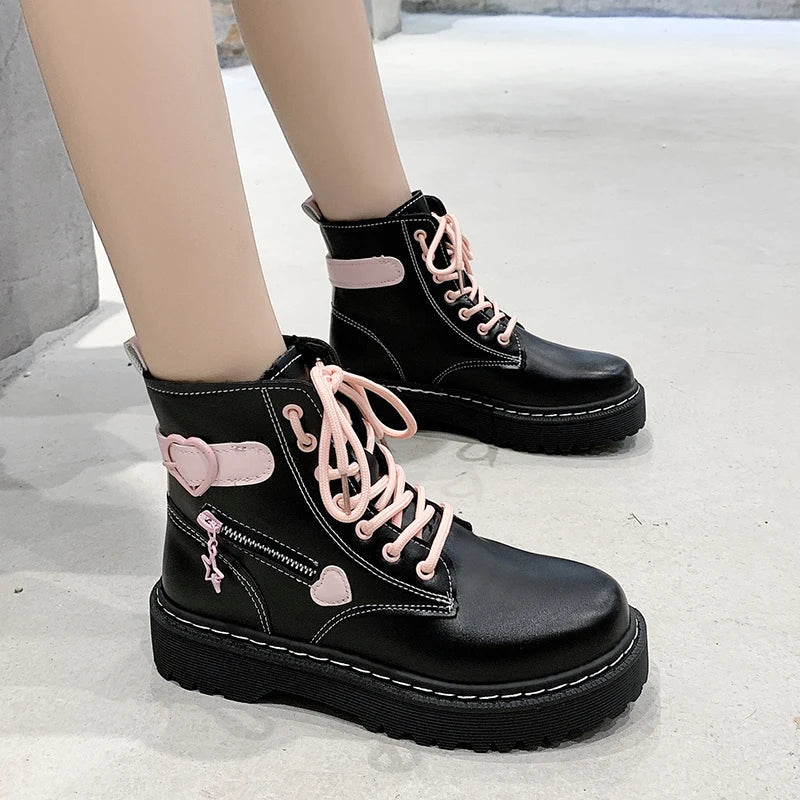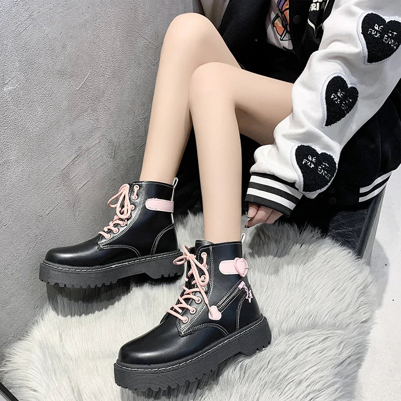 Discover the ultimate alternative style with our Gothic boots featuring a thick sole, perfect for women unafraid to highlight their unique character. Made from high-quality PU, these incredible faux leather shoes accentuate a chic Gothic look with a touch of sweetness thanks to their powder pink details. In this pair of black boots, robustness meets elegance. The thick, rugged sole is a real eye-catcher while providing optimal comfort with every step. With their contrasting pastel pink laces, they add a feminine touch to this bold and rebellious silhouette. The lace-up closure ensures a perfect fit, while the side zipper allows for unparalleled ease in putting on and taking off.