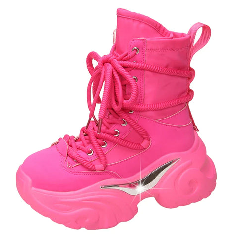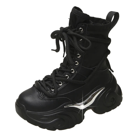 Elevate your style to the next level with the E-Girl platform boots, a true manifesto of punk boldness combined with contemporary aesthetics. These sturdy and trendy shoes are sure to turn heads with their striking silhouette and dynamic cutouts. These carefully crafted black boots feature a functional and avant-garde design that merges comfort with originality. The thick, wavy sole makes them the perfect choice for anyone looking to add a touch of attitude to every step while staying comfortable on the ground. With reflective details that capture light and illuminate your movements, these boots will become your essential accessory for all night explorations in the city. The high-laced design ensures a secure, customizable fit, while the back tongue makes slipping them on easy and fast. Wear them to complete a casual daytime look or to add a rebellious touch to a more sophisticated evening outfit.